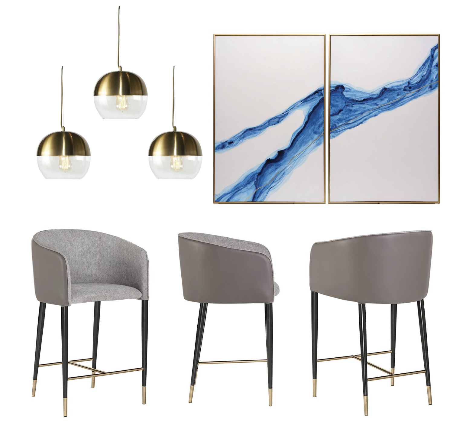 Para este bar nos inspiramos en nuestros bancos modelo Asher de la marca Sunpan. Para complementar en la pared proponemos nuestros cuadros Fluidity. Con iluminación proporcionada por nuestros candiles Ohara.
