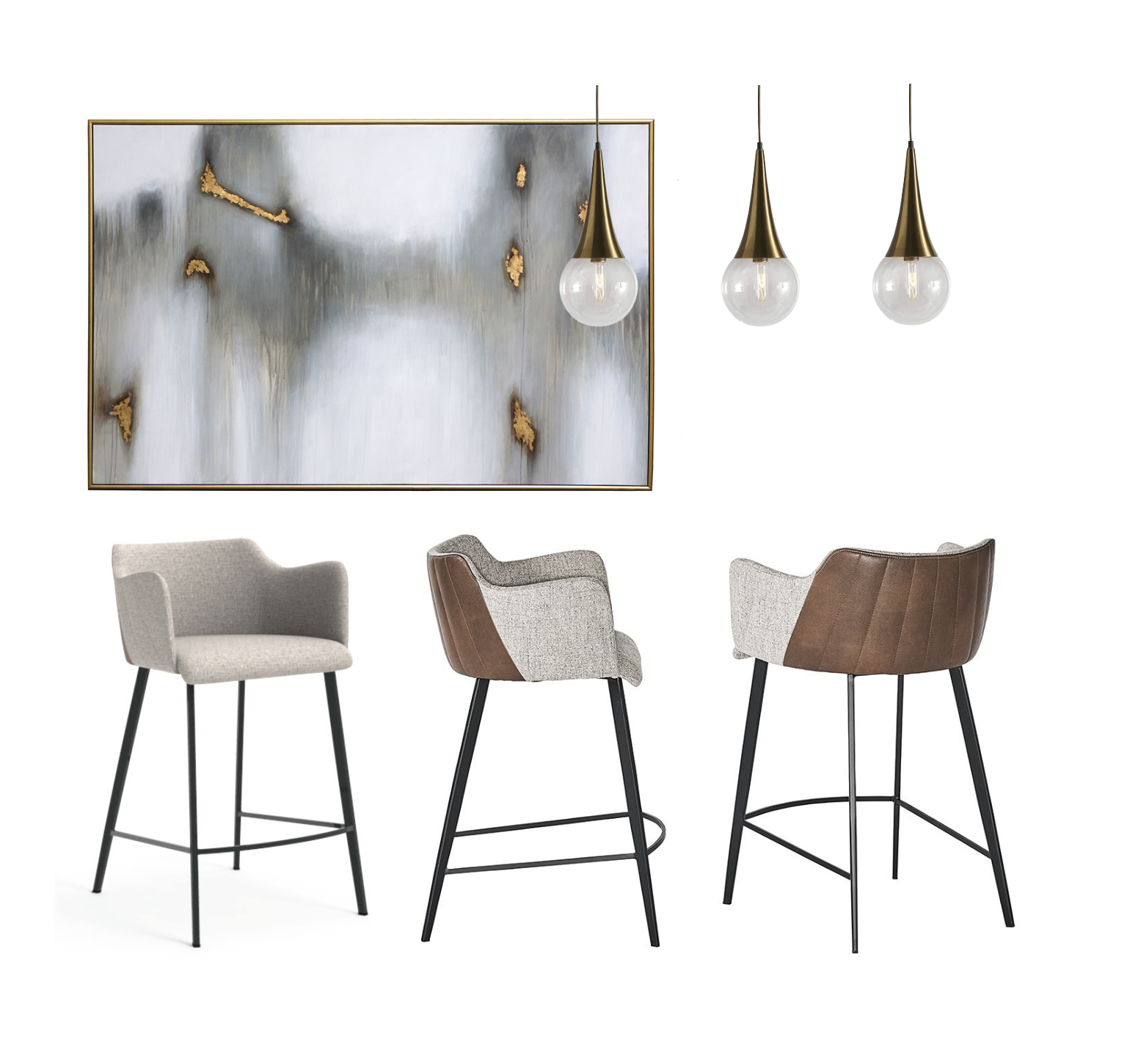 Para este bar nos inspiramos en nuestros bancos modelo Griffin Gray. Para complementar en la pared proponemos nuestro Water Marks Floater Frame terminado con una iluminación proporcionada por nuestros candiles Ohara para darle unos toques de dorado.