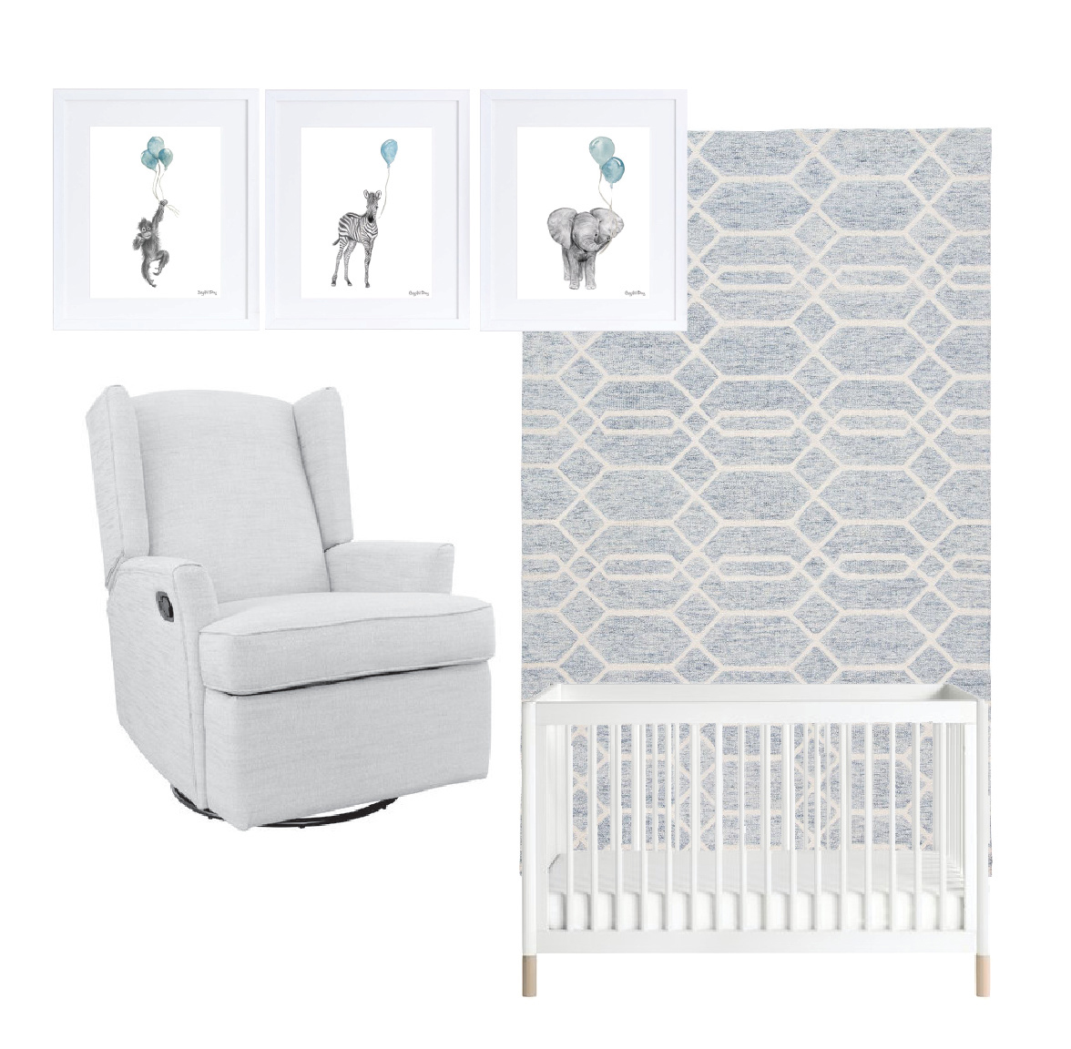 En esta Recamara para escogimos un tapete BELFORT blue gray, unos cuadros de Crystel Bay con tonos celestes, combinado con una cuna blanca y mecedora gris claro.