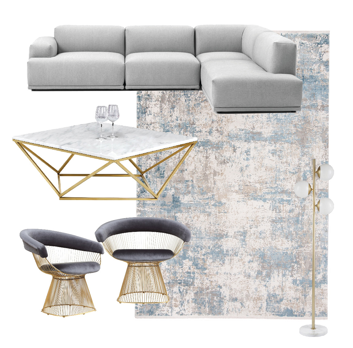 En esta sala resaltamos nuestro tapete Cadiz ivory Blue , con elementos grises, blancos y dorados.