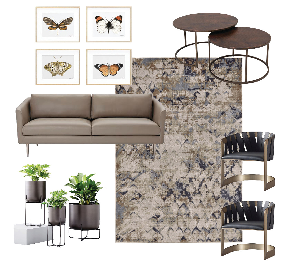 En esta estancia presentamos nuestro tapete Cannes blue beige, recomendamos cuadros de Crystel Bay y elementos en tonos cafés y neutros.