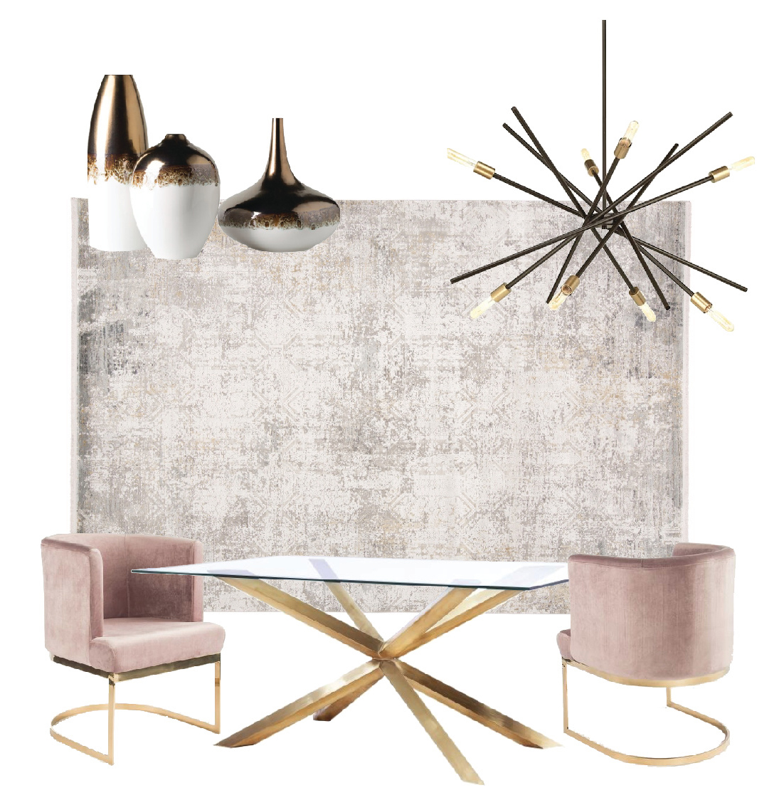 En este comedor nos inspiró la calidez de nuestro tapete Cadiz ivory gray,  complementado con detalles en cobre, dorado y rosas.