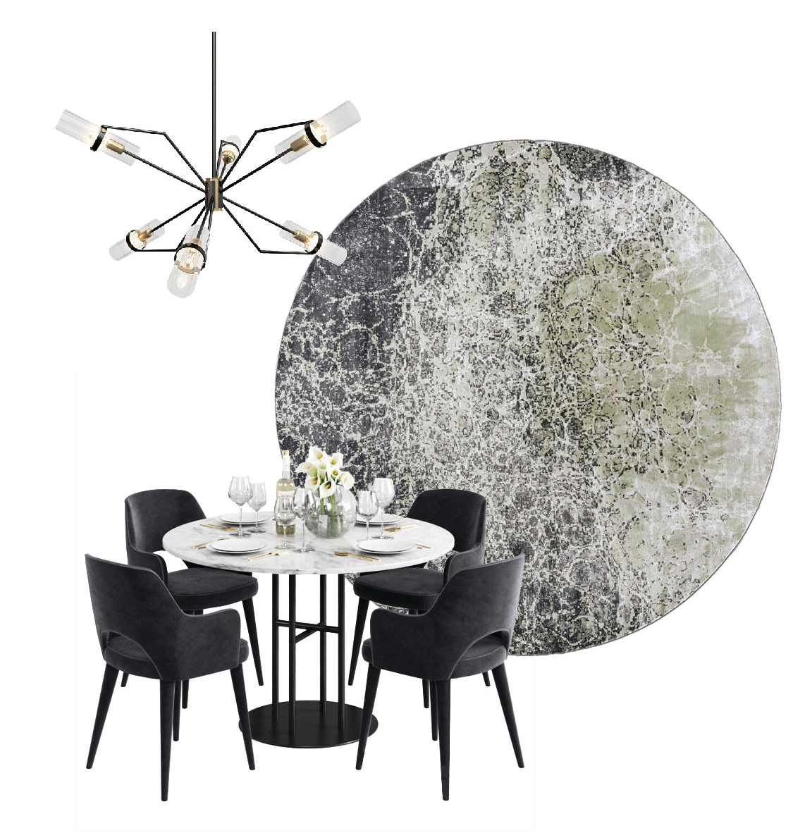En este comedor nos inspiramos en nuestro tapete KATARI castle taupe en redondo. sillas en color gris y un candelabro como pudiera ser nuestro Faraday.