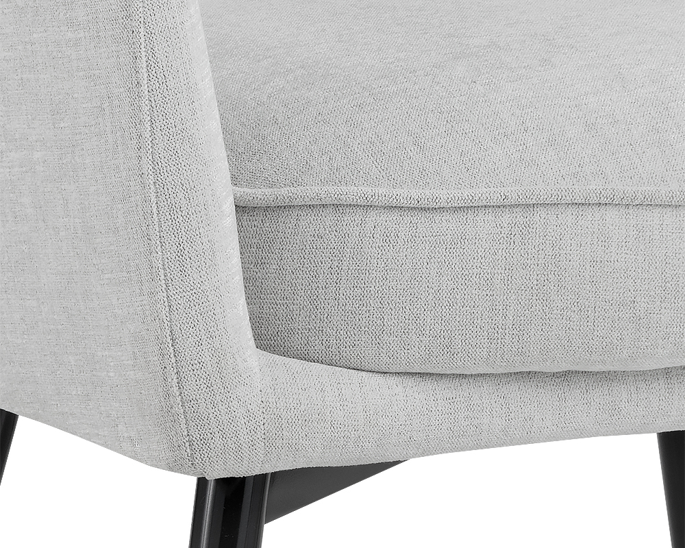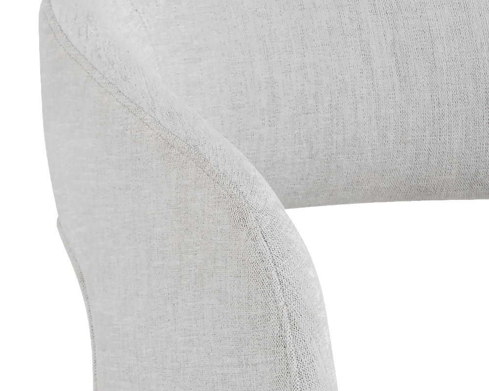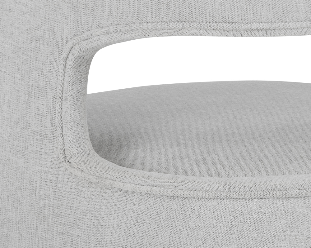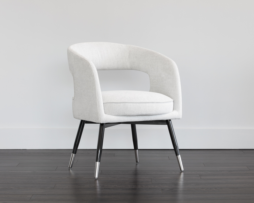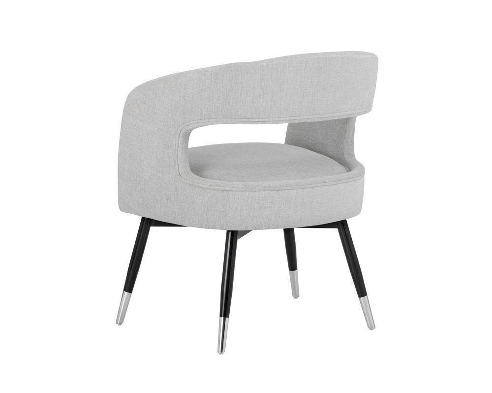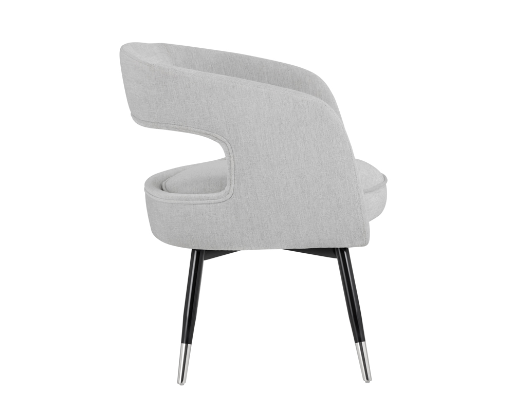 Este moderno sillón de comedor con respaldo en forma de barril de nuestra colección Club se sienta cómodamente en nuestra suave tela de mármol hemingway con un gran recorte en el respaldo. Acabado con patas de madera negra y tapones para pies de acero inoxidable pulido. Un diseño impresionante para comedores y espacios de salón más pequeños.