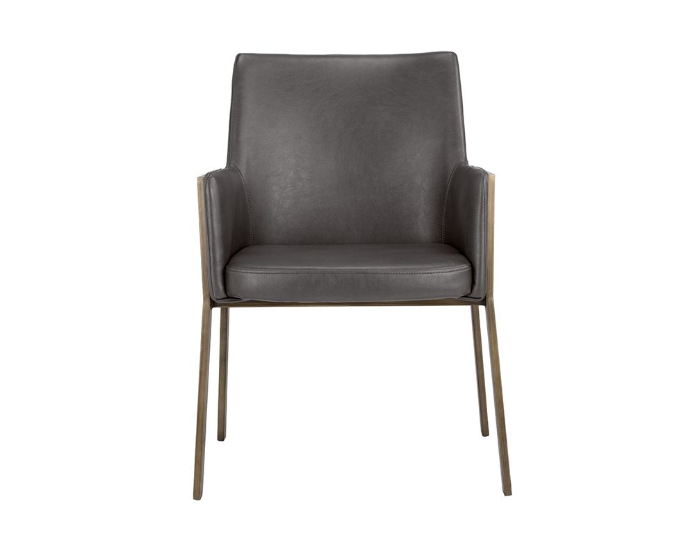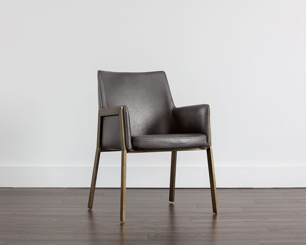 Este sillón de comedor de nuestra colección Ikon presenta un diseño bien proporcionado con un marco de latón antiguo cepillado expuesto. Disponible en cuero sintético bravo almirante, negro, coñac y gris kendall.