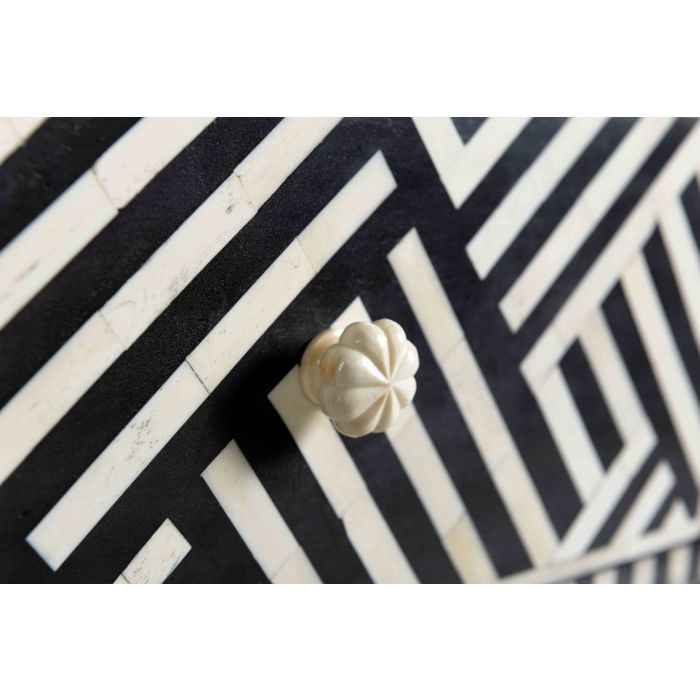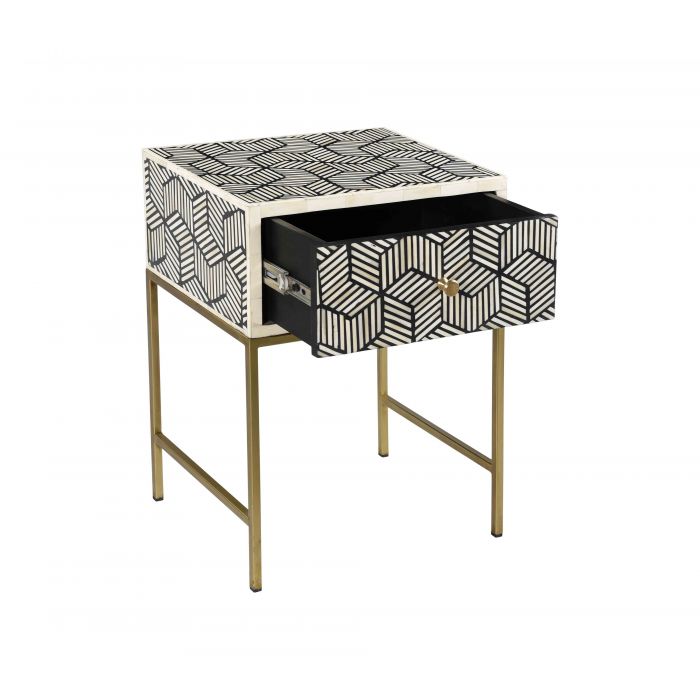 Los mosaicos hechos a mano con incrustaciones de hueso le dan a esta mesa auxiliar, por lo demás simple, una innegable sensación de lujo. Disponible en dos opciones de color para adaptarse a sus necesidades de decoración.