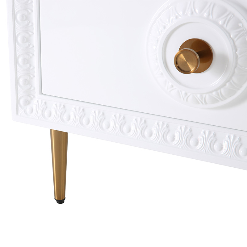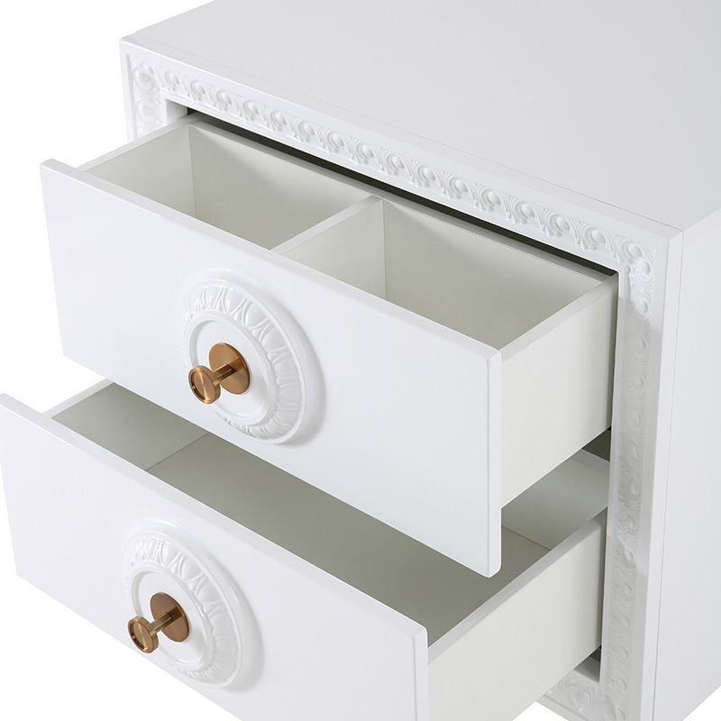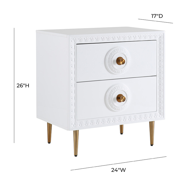 Agregue un elemento de moda fabulosamente glamorosa con la mesa auxiliar Bovey. Con un acabado de laca con molduras intrincadas, herrajes dorados y toneladas de espacio de almacenamiento, está disponible en dos colores para adaptarse a su gusto de moda.