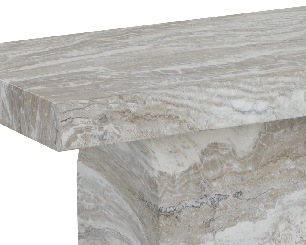 Un banco contemporáneo que ilustra la belleza de los elementos naturales. Elaborado a partir de hormigón sellado color topo con un acabado de aspecto mármol. Apto para espacios cubiertos interiores y exteriores.