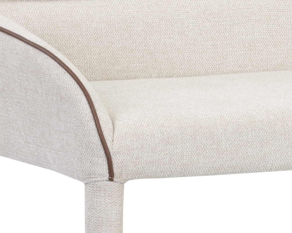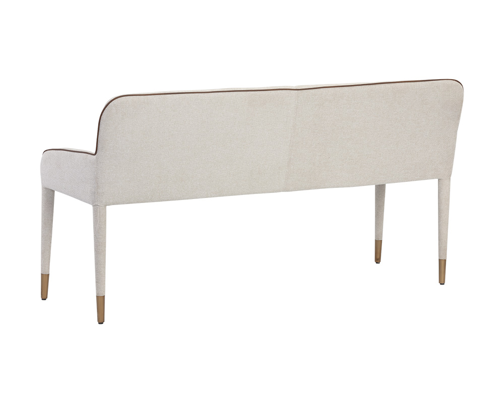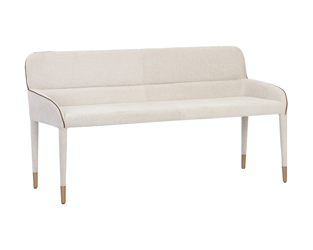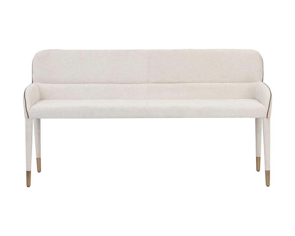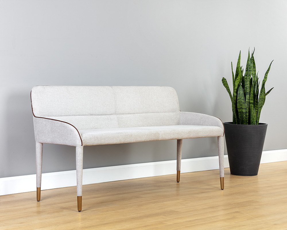 Cree una disposición de asientos moderna con esta banqueta de la colección Ikon. Tapizado en tejido belfast avena con ribetes de piel sintética bravo coñac. Los reposapiés de oro cepillado completan el look.