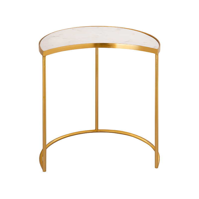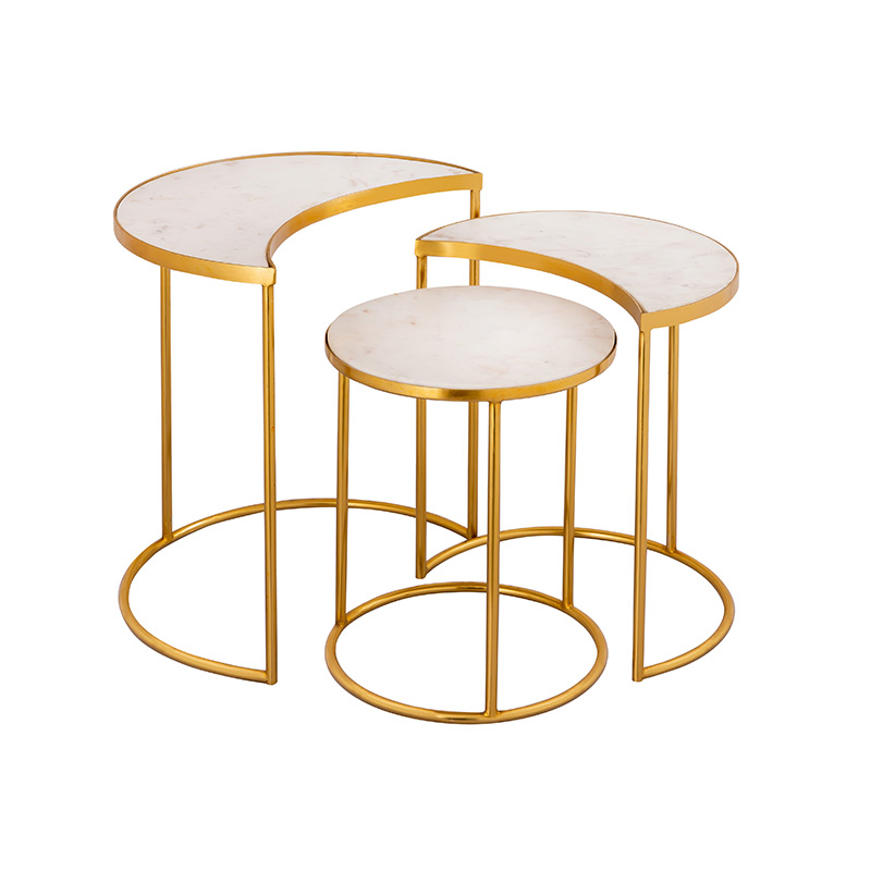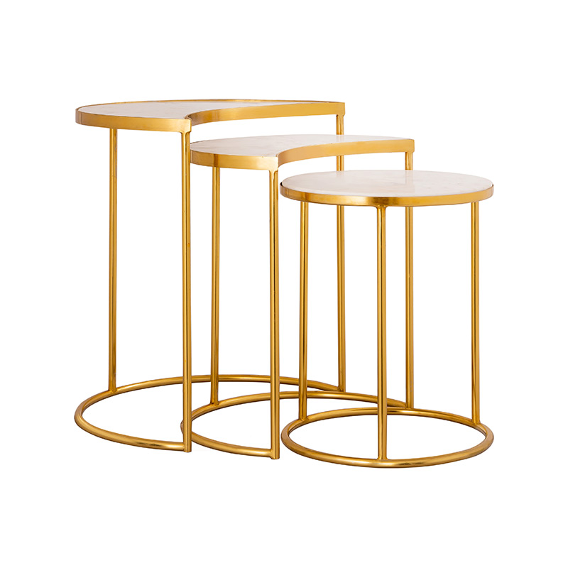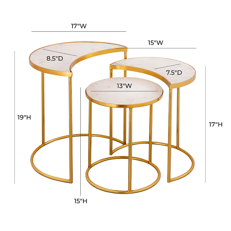 Agregue un toque de elegancia a su espacio vital con este moderno juego de mesa de Inspire Me! Decoración del hogar y TOV. Estas mesas hechas a mano cuentan con un hermoso acabado dorado, marco abierto y tapas de mármol genuino. Convenientemente se anidan entre sí, proporcionando espacio adicional en la superficie según lo necesite.