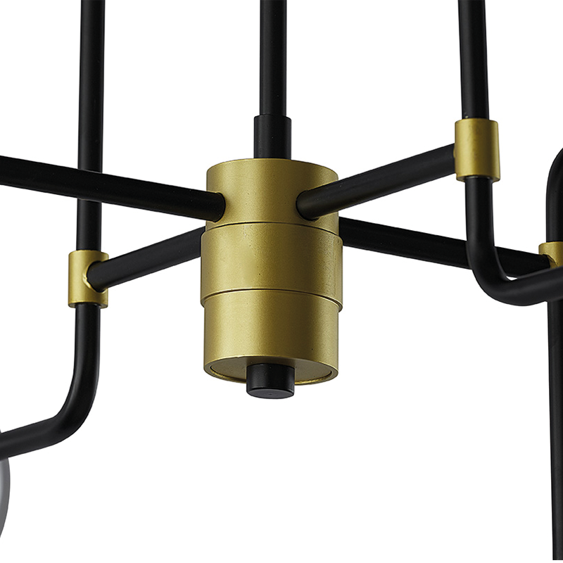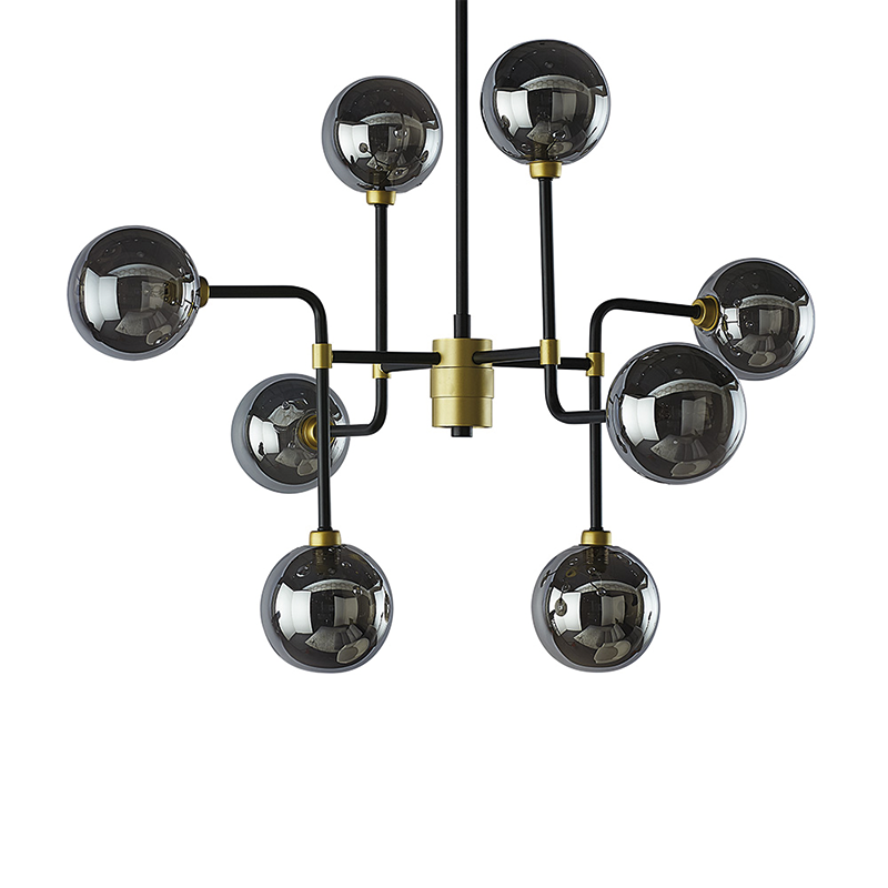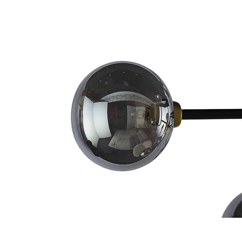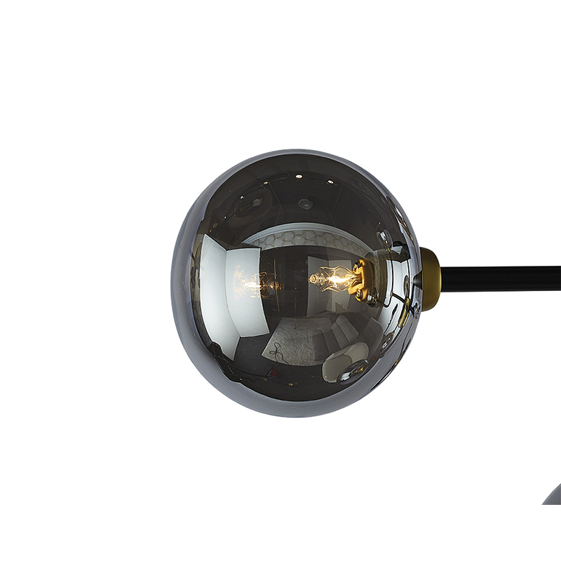 Esta moderna luz de techo creará un ambiente atractivo en los espacios de vida, salón y comedor. Cuenta con varillas de hierro negro con herrajes dorados con vidrio gris humo. Instala múltiples para una apariencia dramática. Disponible en tallas grandes y pequeñas.