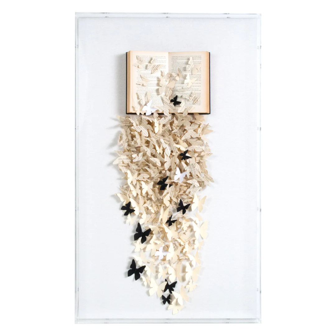 Jen Lin es la visionaria creativa detrás de esta obra de arte tridimensional única. Un equipo de artistas del estudio fabrica cada pieza a mano para que no haya dos exactamente iguales. Desde arte de libros hasta mariposas dispersas, la serie Jen Lin nunca deja de sorprender y deleitar con su elegante sensibilidad de Hong Kong.