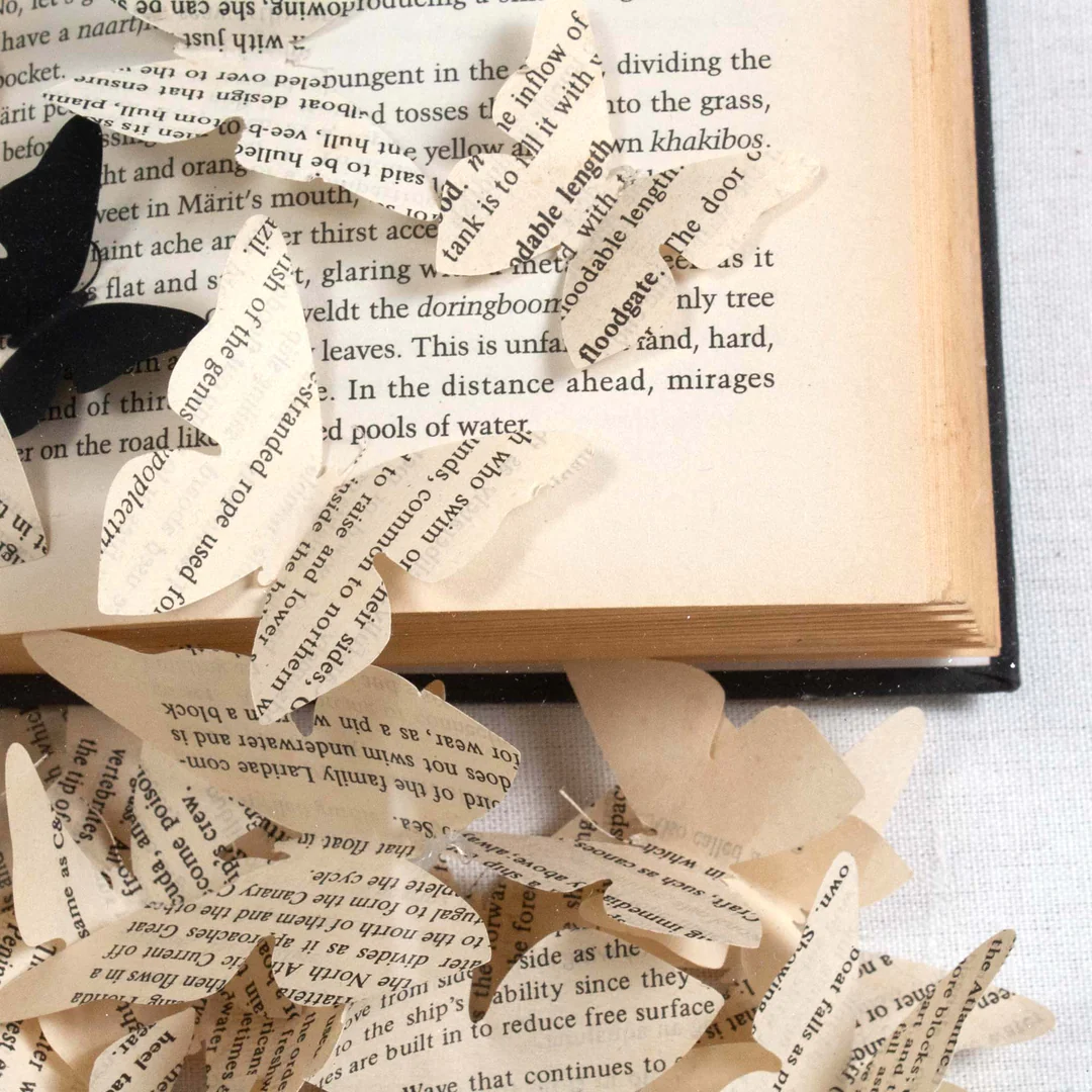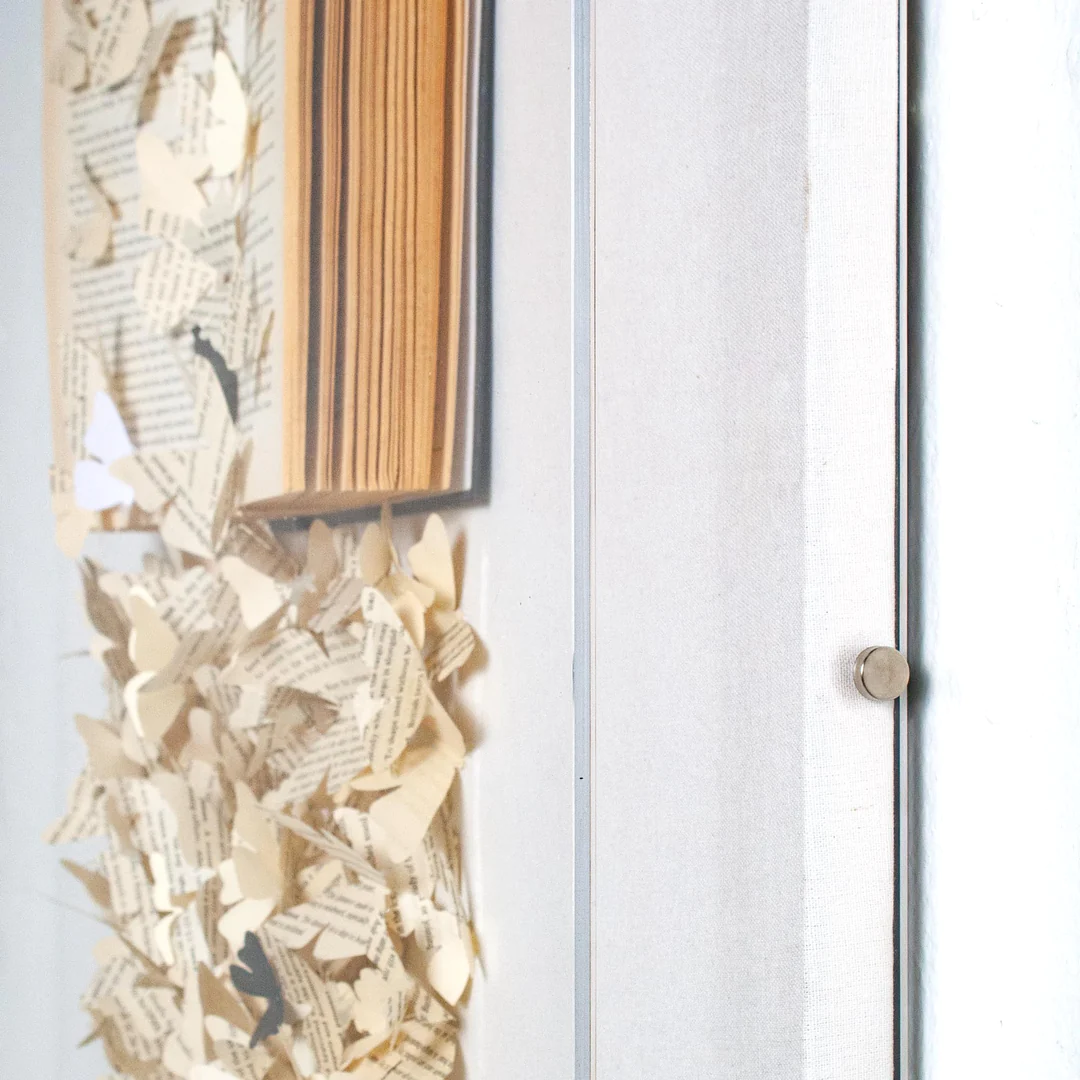 Un libro abierto está inundado de mariposas cortadas a mano en las páginas del libro. Montado sobre un lienzo de lino blanco y enmarcado en una caja de sombras acrílicas para un increíble efecto 3D.