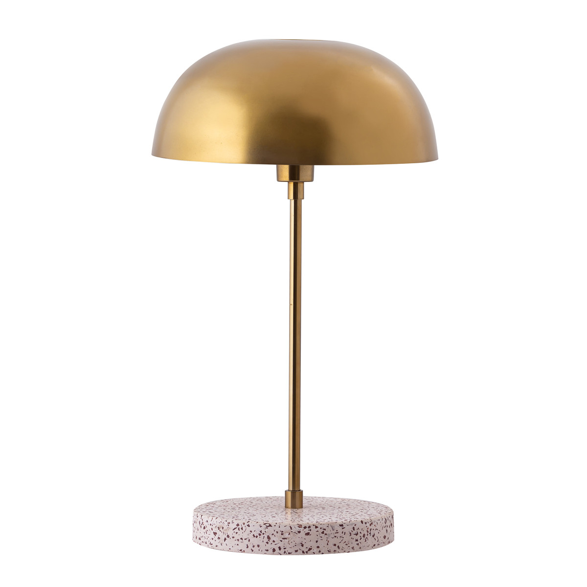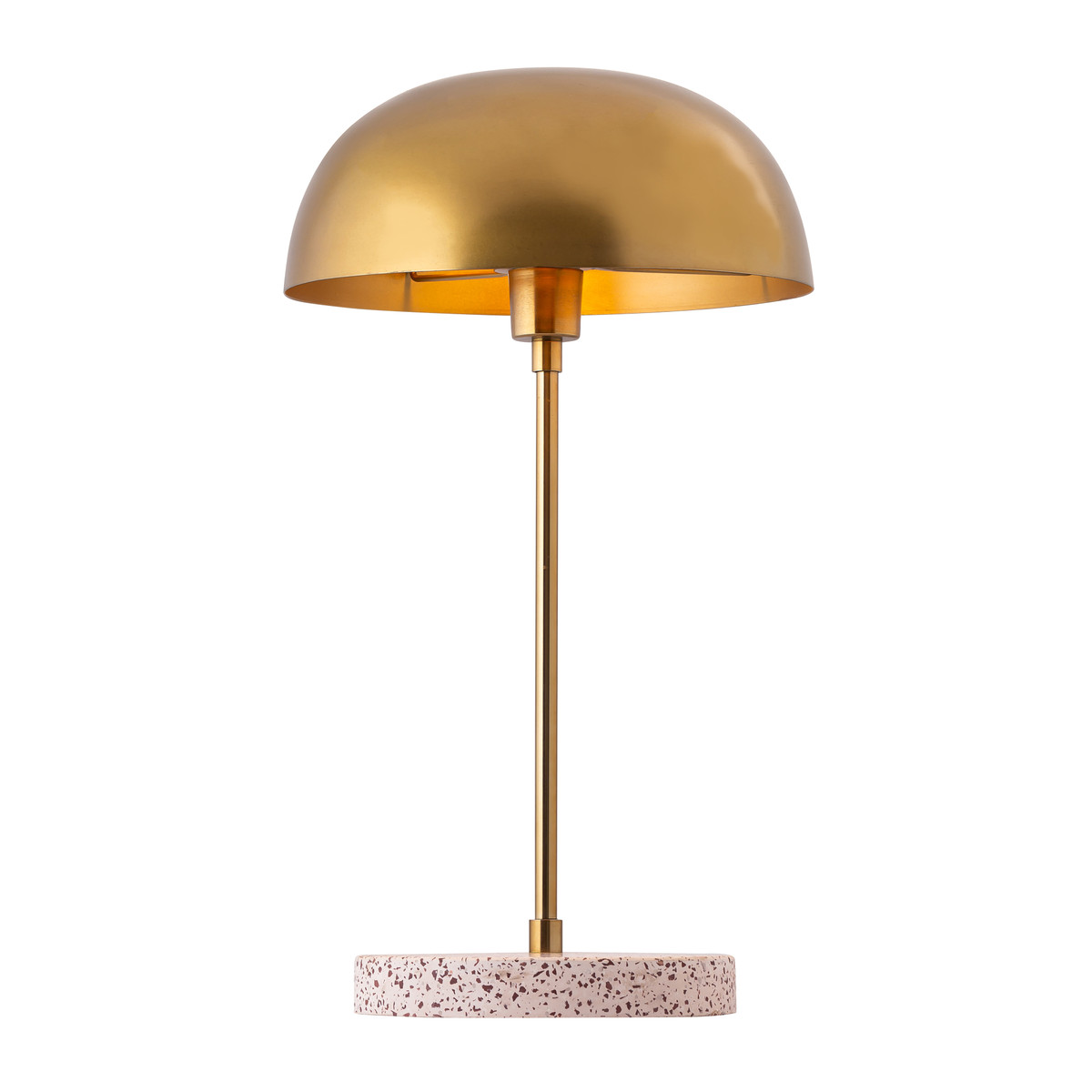 Ilumina cualquier habitación con la hermosa y refinada lámpara Emory. Esta encantadora lámpara de mesa cuenta con una pantalla de latón reluciente hecha de hierro que se complementa con una base de hormigón con acabado de terrazo.