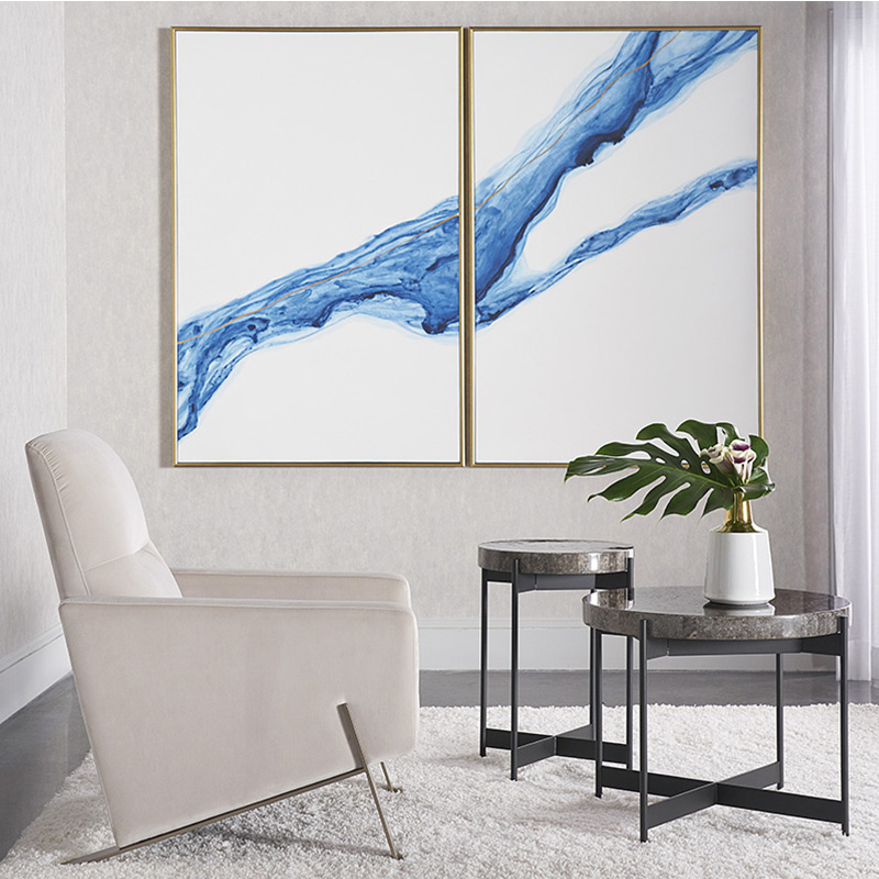 Esta pintura díptica crea un ambiente refrescante con espectaculares trazos azules y dorados similares al agua que fluye. Cuenta con un marco flotante con acabado dorado.