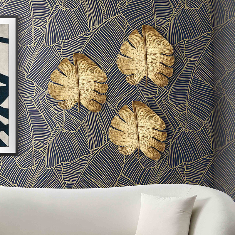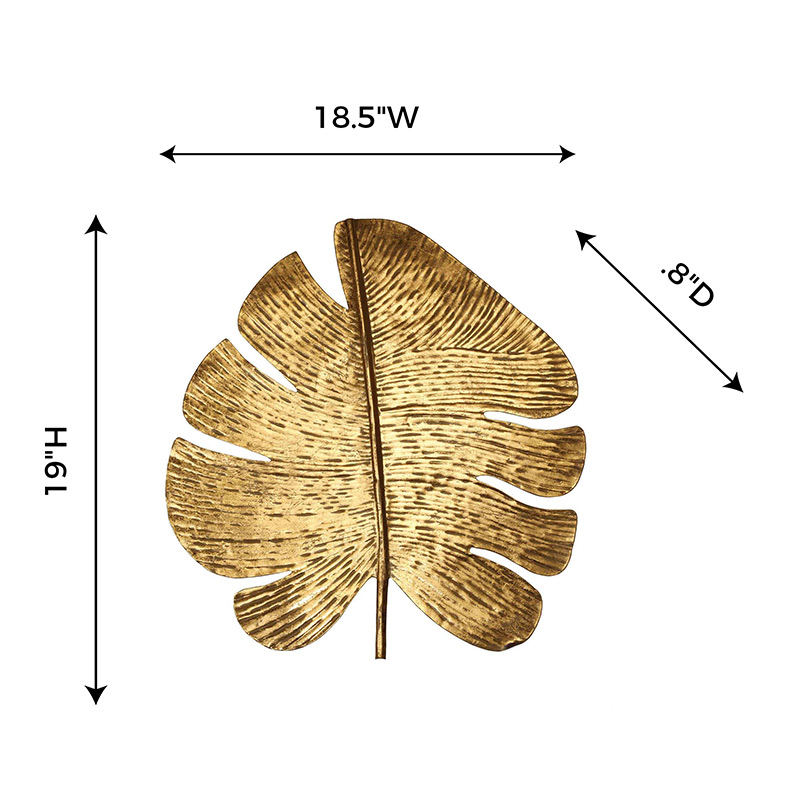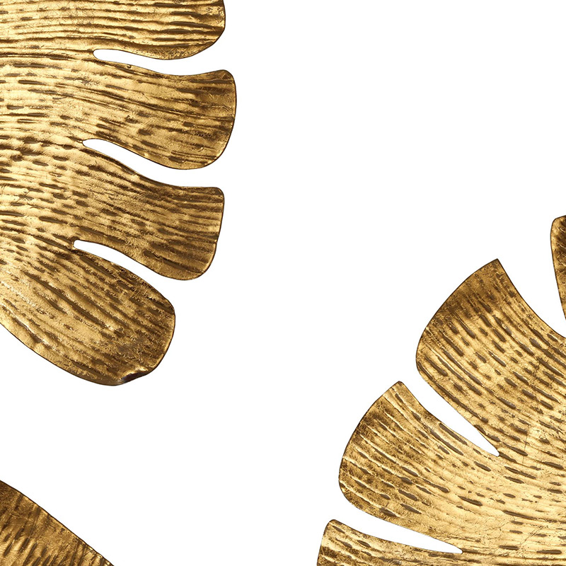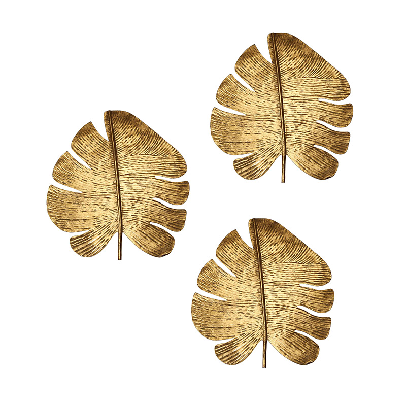 Este conjunto de arte de pared presenta tres hojas bellamente esculpidas creadas en hierro fundido y terminadas en tonos dorados.