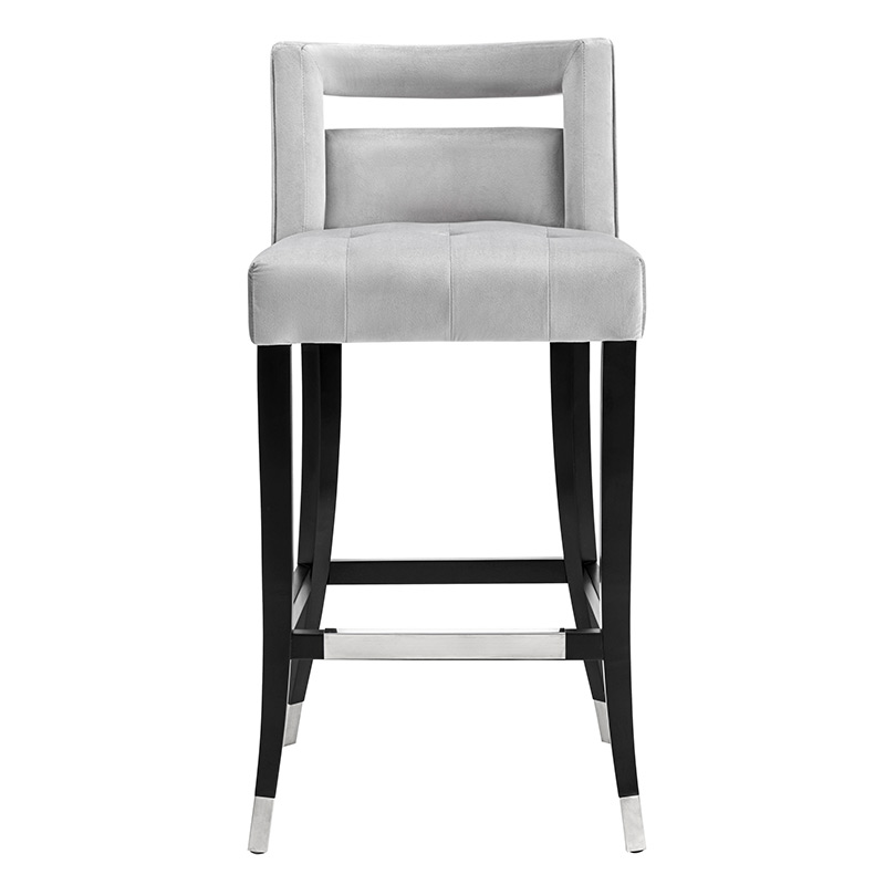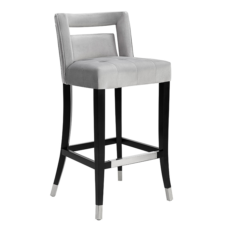 Haciendo su debut con una declaración audaz, el taburete Hart está disponible en opciones de altura de barra y mostrador, en suntuoso terciopelo gris o azul marino. Los cabezales de uñas aplicados a mano y las patas con punta de metal combinan con el reposapiés que lo acompaña.