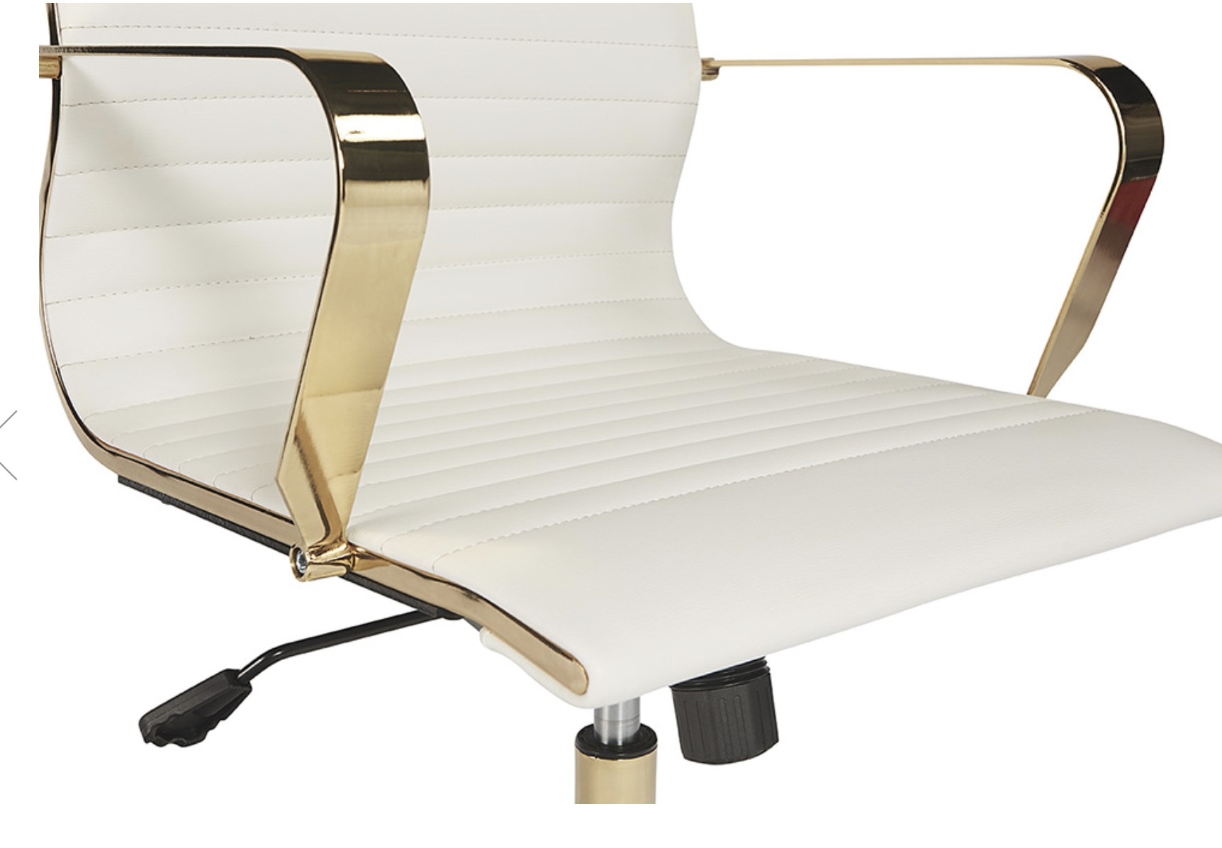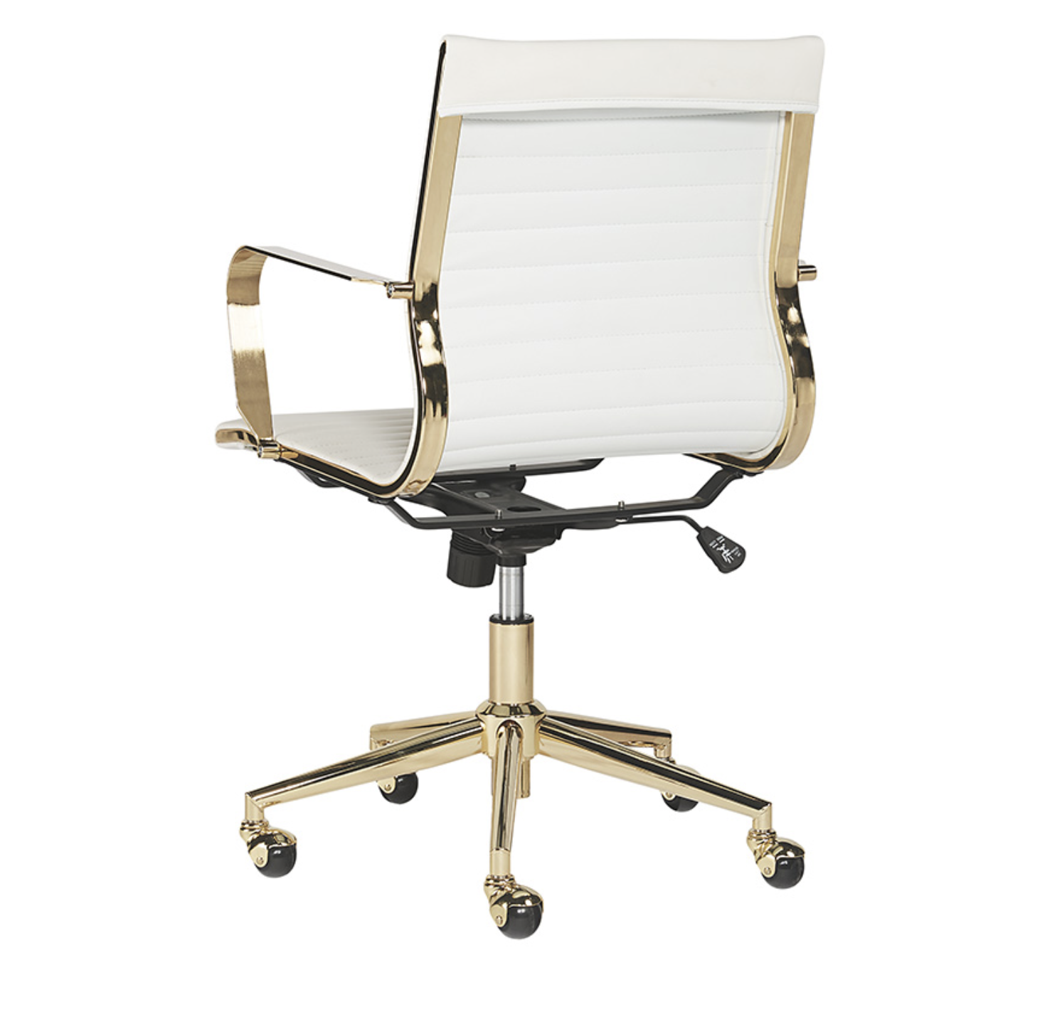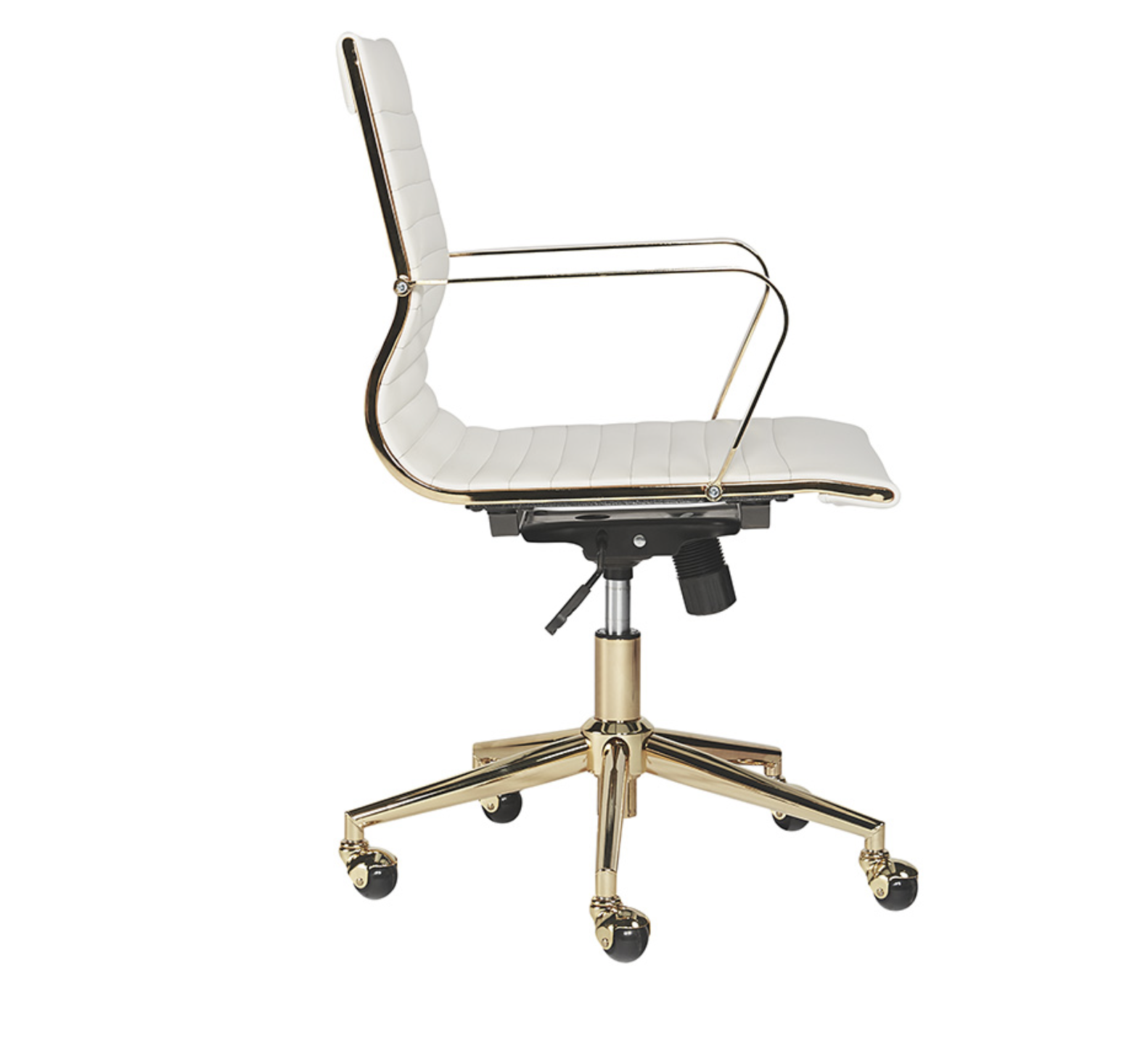 Esta silla de oficina ofrece una feminidad glamorosa. Cuenta con mechones de canal horizontal en el respaldo del asiento con un impresionante marco de acero dorado pulido y ruedas para mayor movilidad. Disponible en piel sintética negra. Manipular con cuidado: este diseño ha sido elaborado con piel sintética. La piel sintética se fabrica para reflejar las características naturales de la piel; como tal, las variaciones de color, las marcas, las arrugas, los surcos y los rayones leves son características apreciadas. No habrá dos piezas iguales. Visite nuestra página de Cuidado del producto para obtener más información sobre cómo garantizar la belleza duradera de esta pieza.