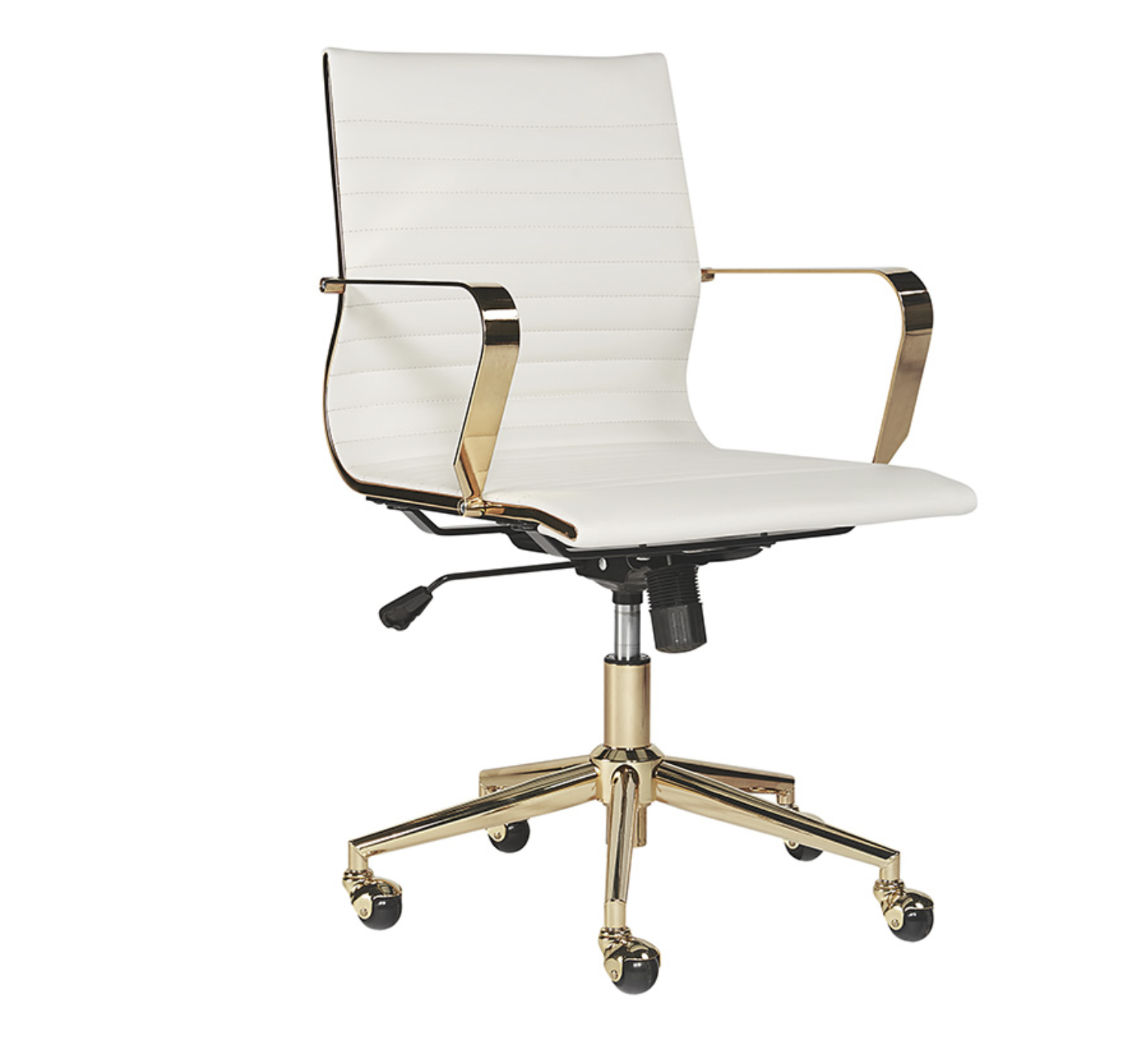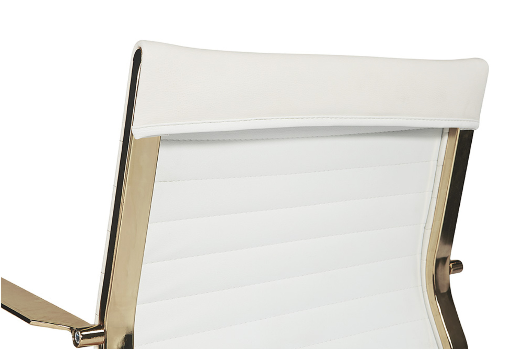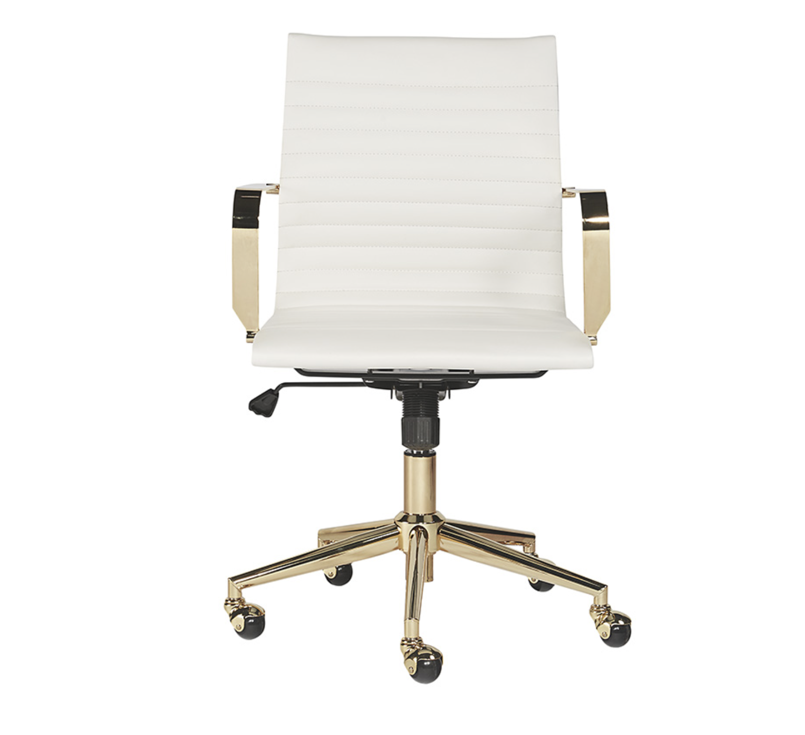 Esta silla de oficina ofrece una feminidad glamorosa. Cuenta con mechones de canal horizontal en el respaldo del asiento con un impresionante marco de acero dorado pulido y ruedas para mayor movilidad. Disponible en piel sintética negra. Manipular con cuidado: este diseño ha sido elaborado con piel sintética. La piel sintética se fabrica para reflejar las características naturales de la piel; como tal, las variaciones de color, las marcas, las arrugas, los surcos y los rayones leves son características apreciadas. No habrá dos piezas iguales. Visite nuestra página de Cuidado del producto para obtener más información sobre cómo garantizar la belleza duradera de esta pieza.