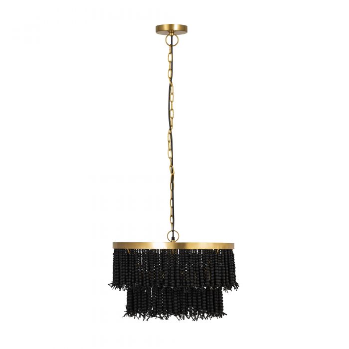 Moderno, glamoroso y destinado a hacer una declaración, el colgante Krish está hecho de hierro con acabado de latón con dos hileras de cuentas de madera negras que forman su sombra.