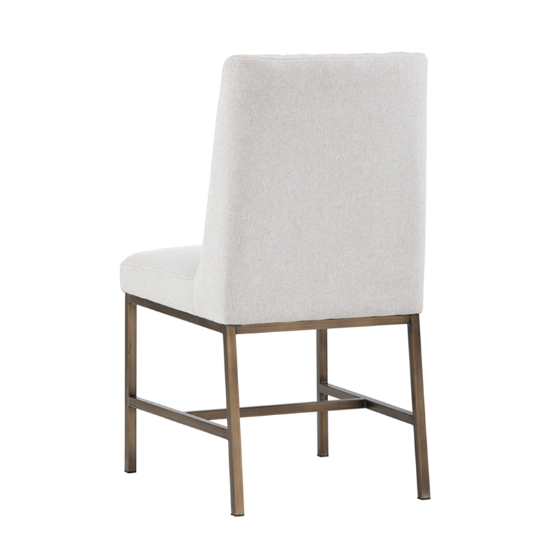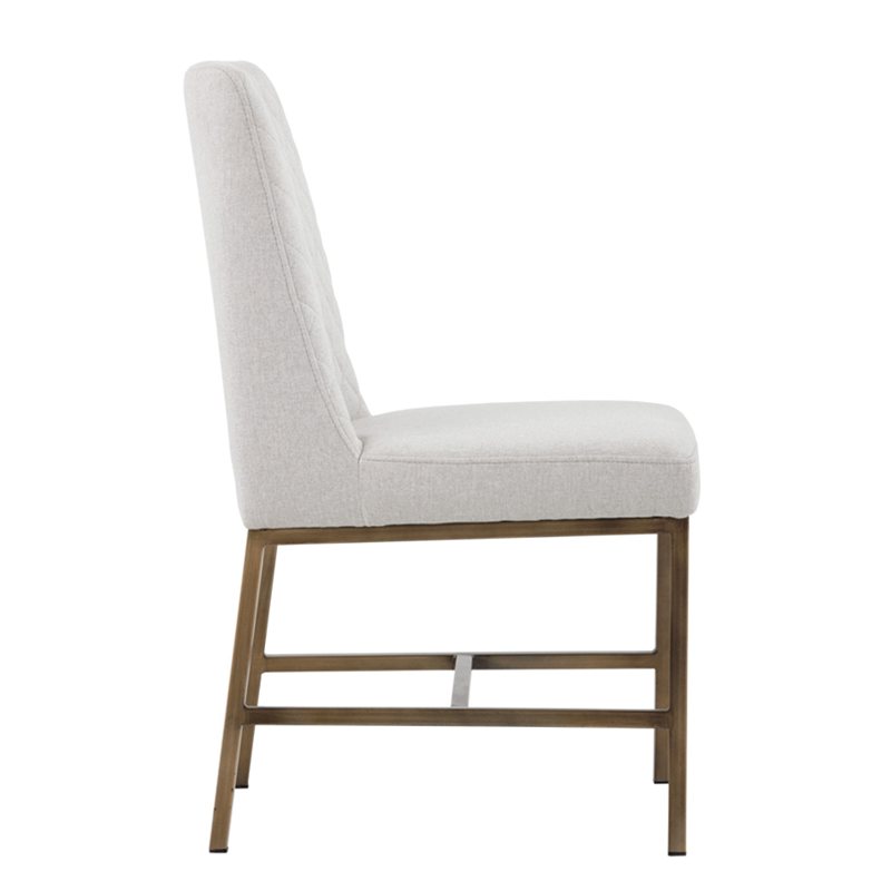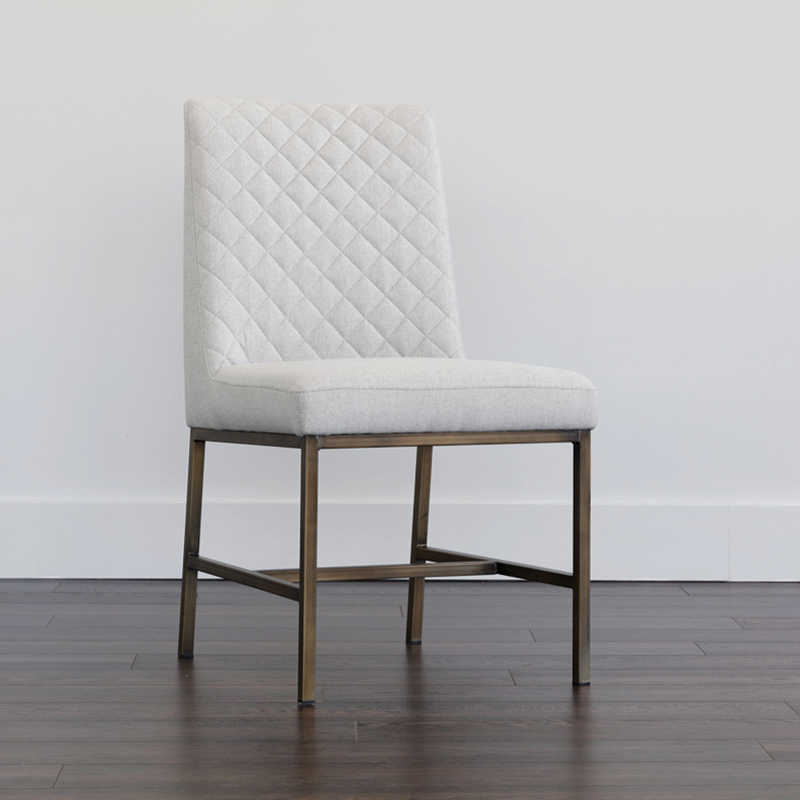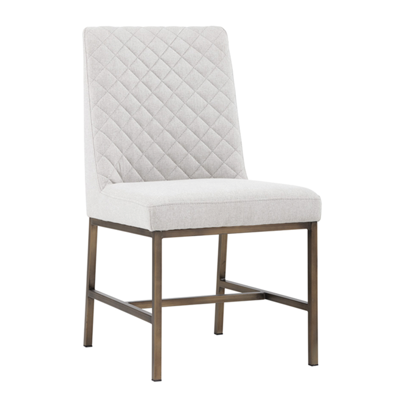 Vigorice los espacios de comedor de transición con esta silla de comedor de nuestra colección 5West. Cuenta con hermosas costuras de diamantes en el respaldo del asiento interior y un marco de acero con marco de latón antiguo. Disponible en tela gris claro o gris oscuro y cuero marrón oscuro, crema castillo, negro carbón o piel sintética gris cubierta.