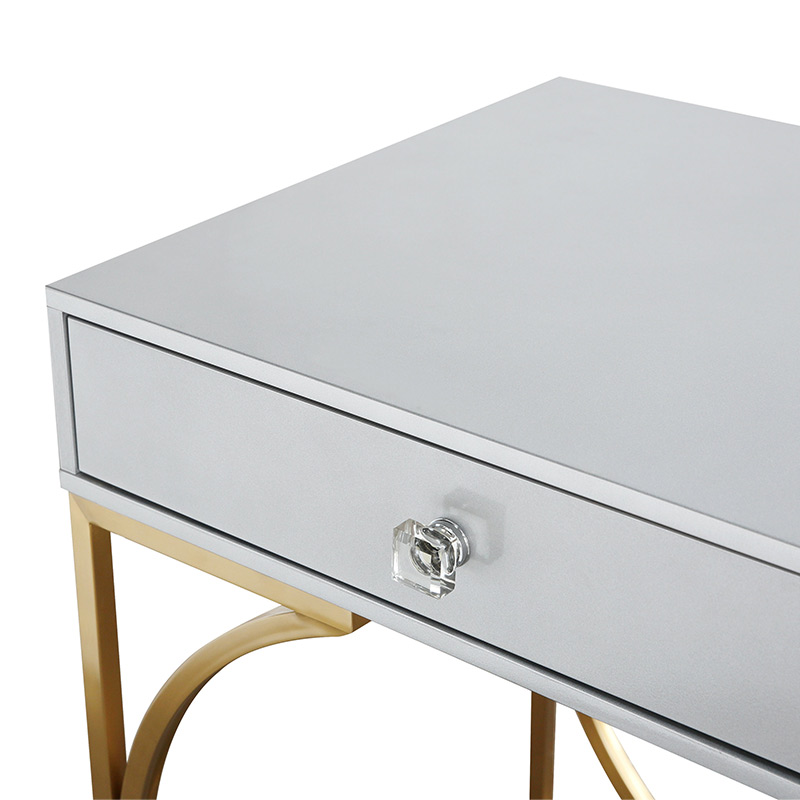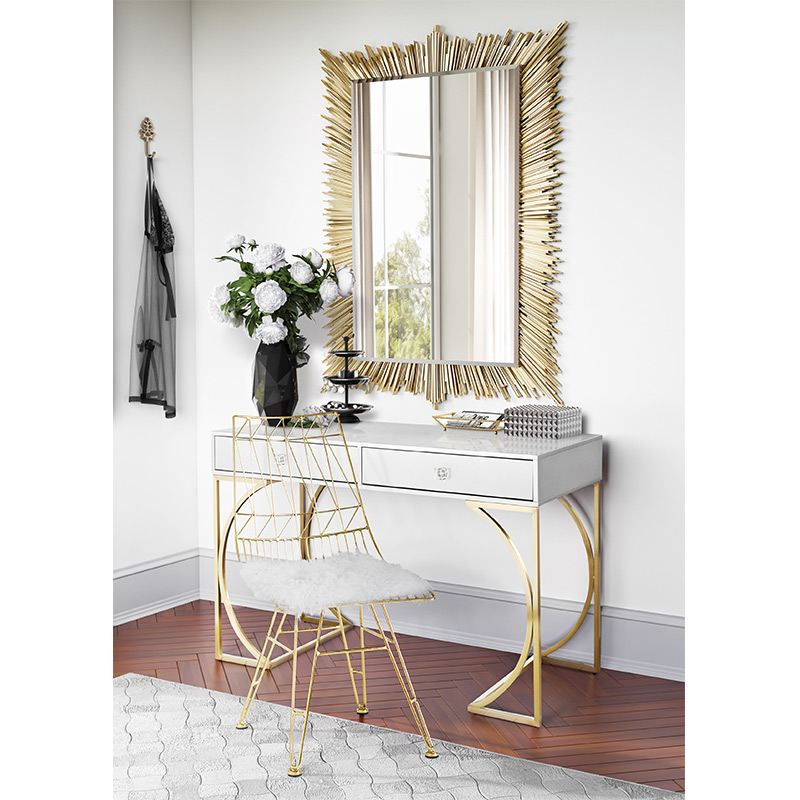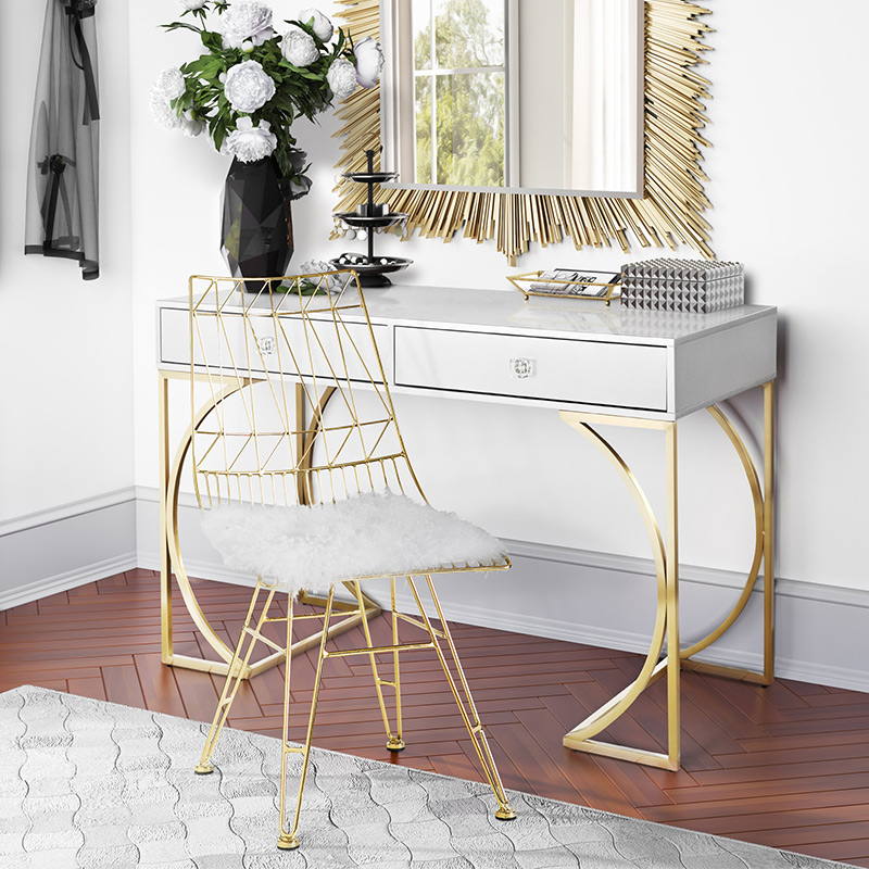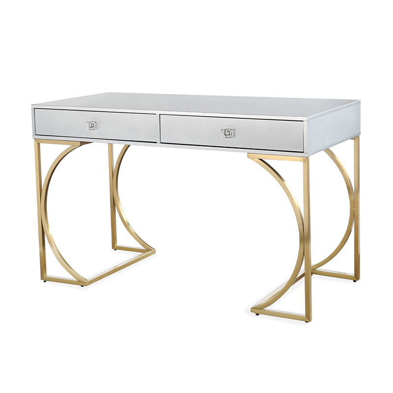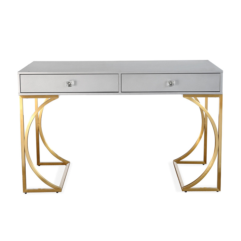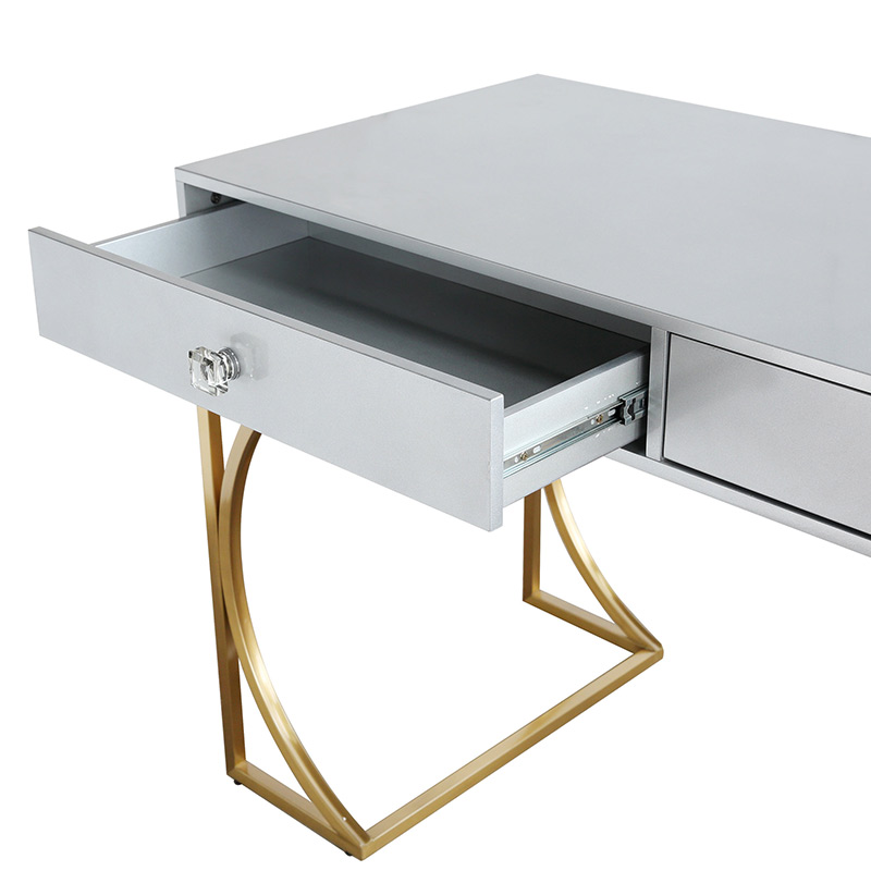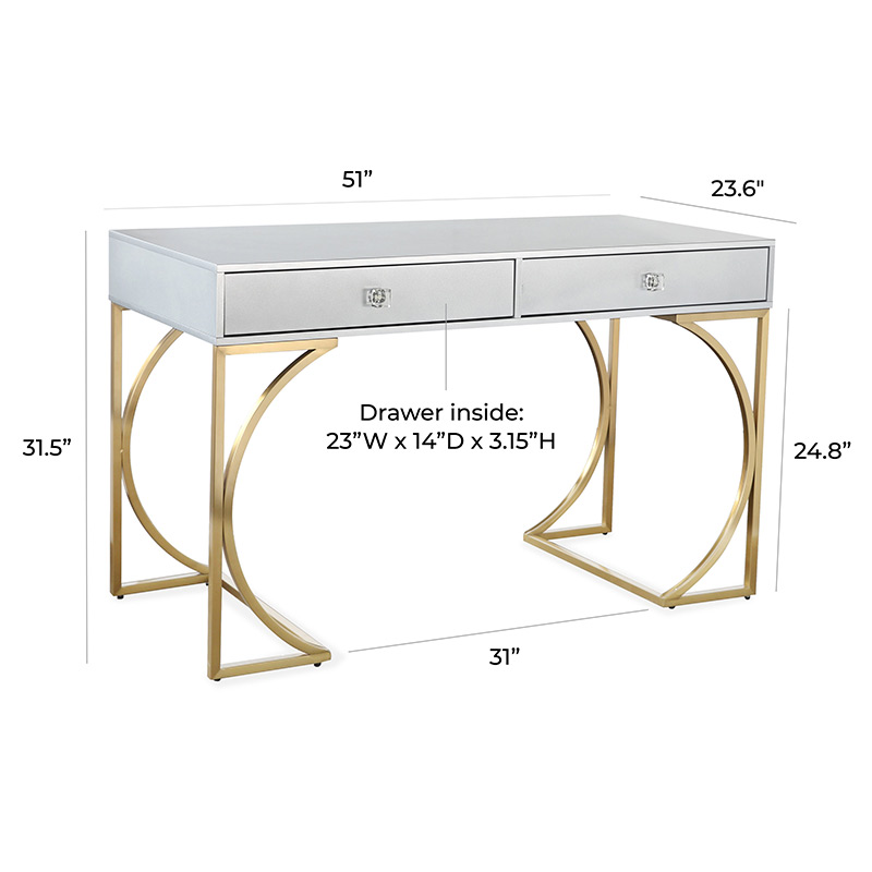 el escritorio Lexie hará una adición glamorosa a cualquier espacio. Un acabado de laca gris mate ofrece un elegante contraste con la base de acero dorado cepillado, mientras que las manijas de los cajones de lucite agregan un toque especial a este elegante escritorio. Dos cajones ofrecen mucho espacio para blocs de notas, bolígrafos y otros artículos esenciales de oficina.