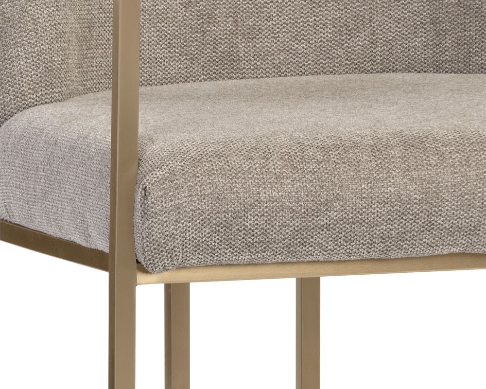 MATERIAL / CUBIERTA:Tela CONSTRUCCIÓN DEL MARCO:Metal BASE / PATAS:Acero inoxidable ACABADO BASE:Latón antiguo CONTENIDO DE LA TELA: 100% poliéster Se venden por set de 2 piezas Precio publicado es de una pieza