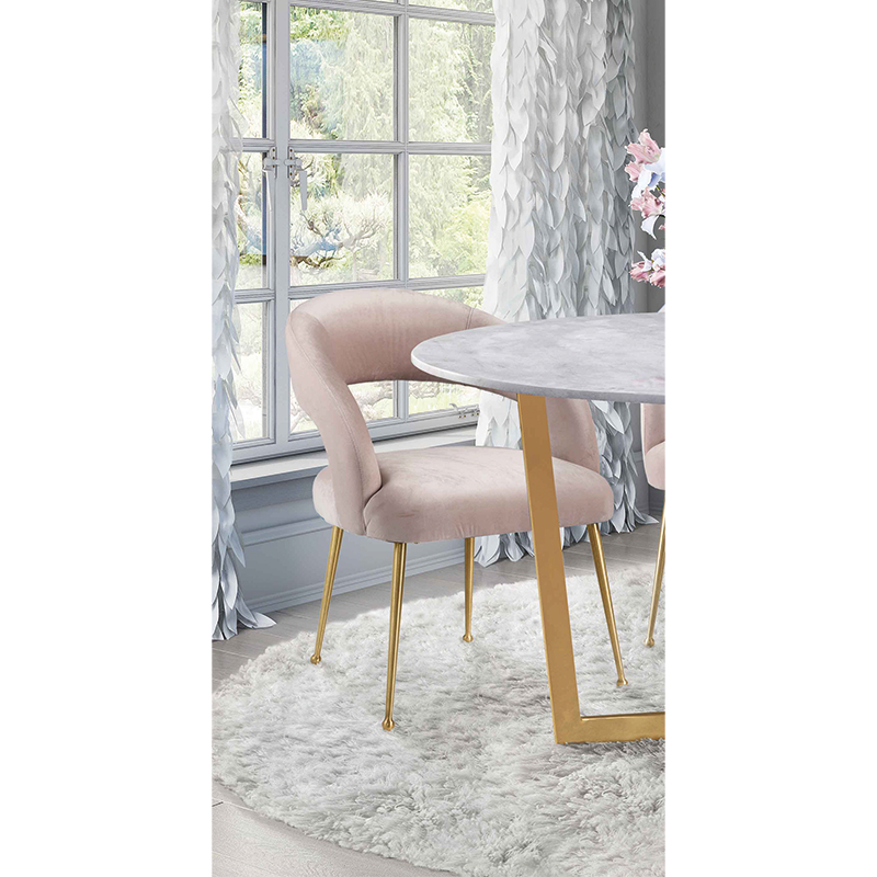 Mid Century Modern se une a Hollywood Glam para formar la llamativa silla de comedor Rocco. Con una tapicería de terciopelo lujosamente suave y elegantes patas de acero inoxidable, esta silla versátil mejorará cualquier área de comedor. Disponible en varias opciones de color, el Rocco complementa maravillosamente nuestra mesa de comedor Maxim.