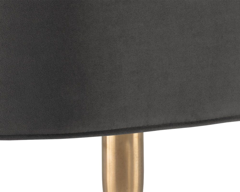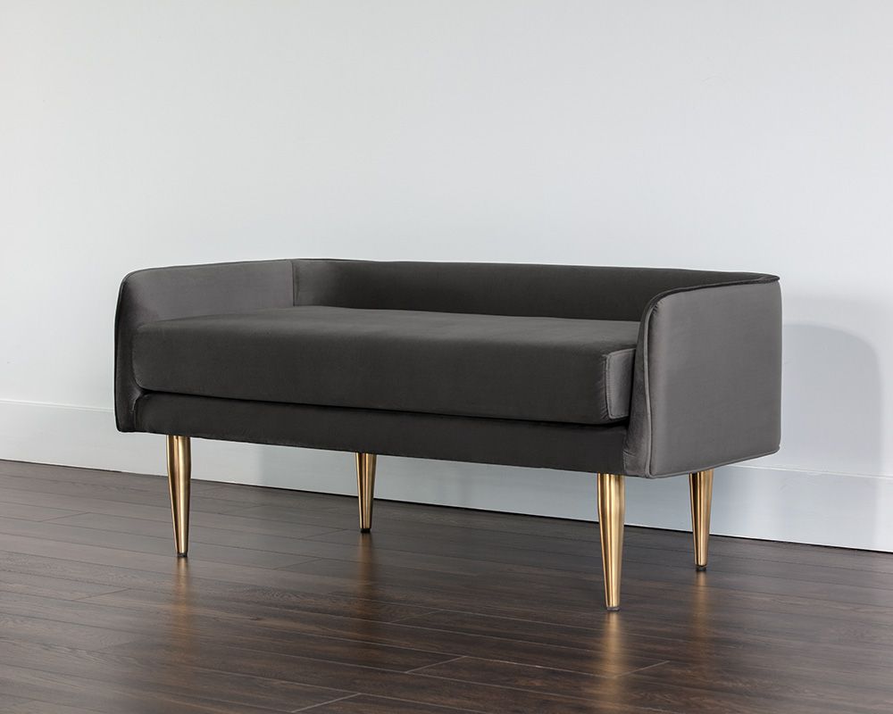 Un banco de delicado diseño adecuado para colocar en un vestíbulo o salón, al pie de una cama o en un vestidor personalizado. Disponible en suave tela celeste negra o gris con patas de acero inoxidable dorado cepillado