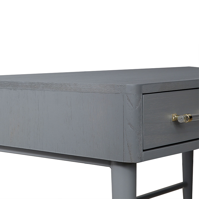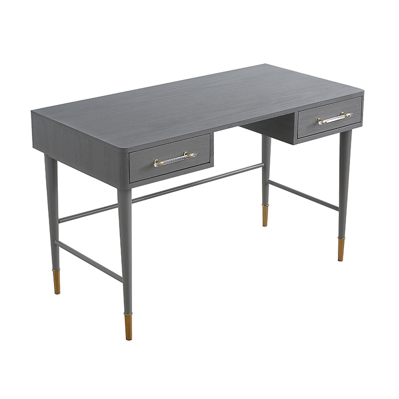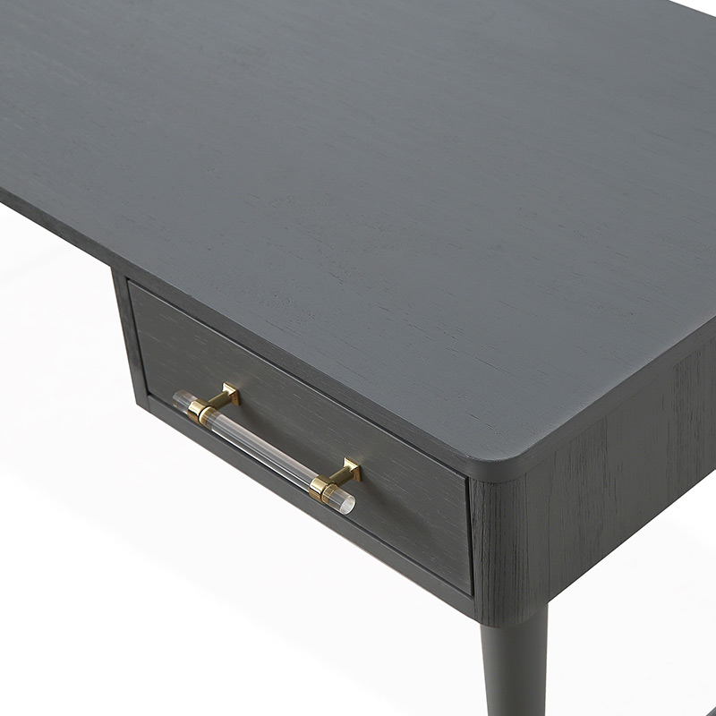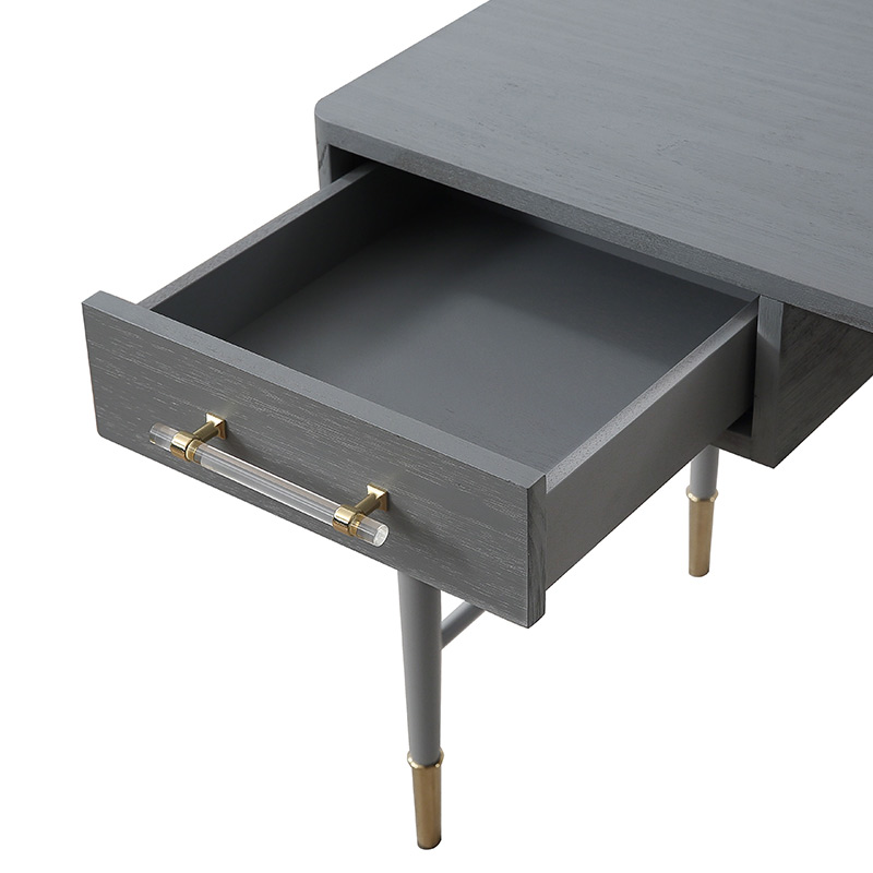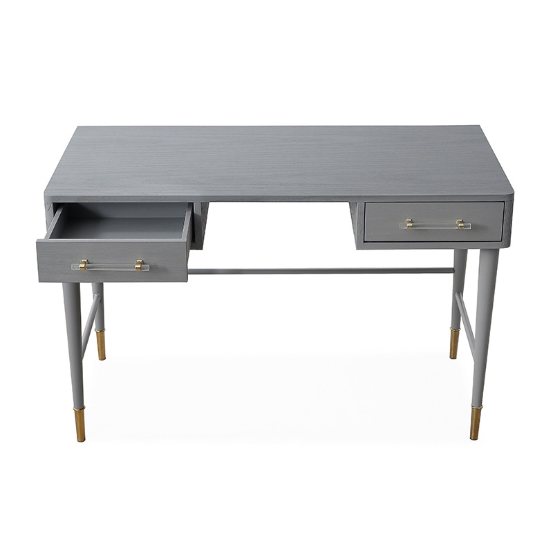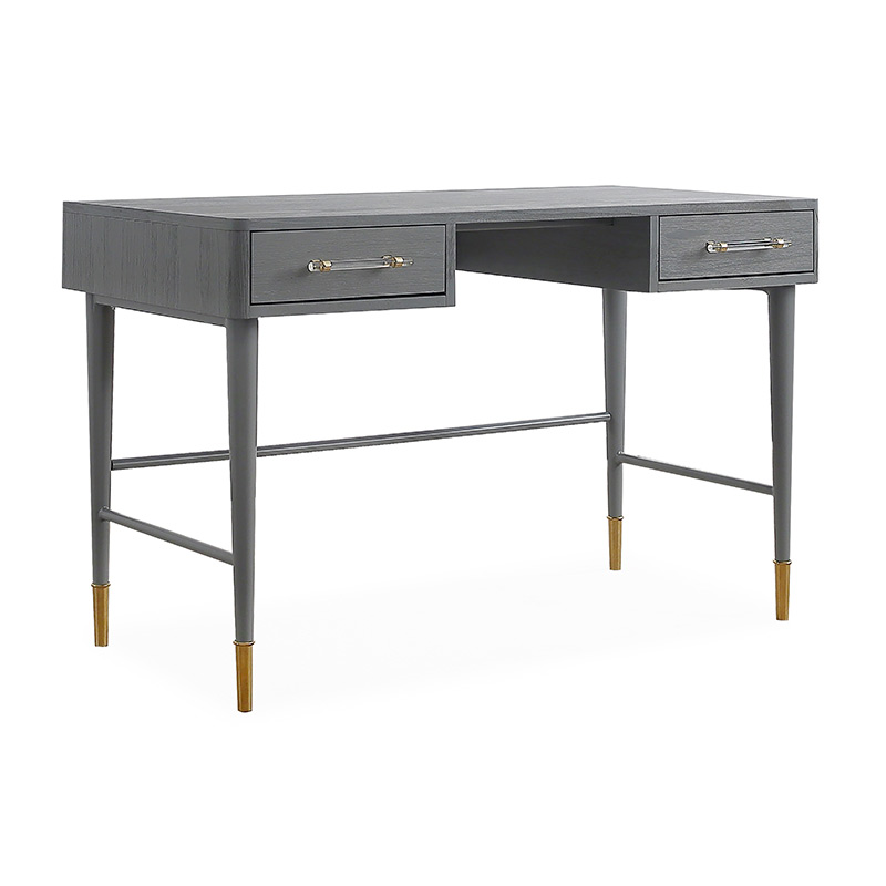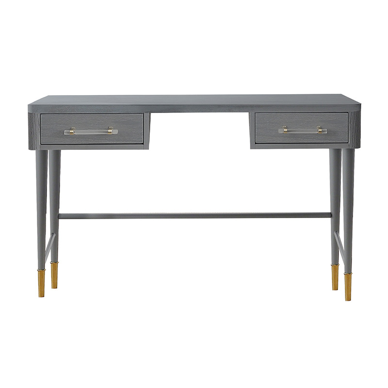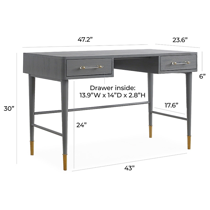El escritorio Lexie hará una adición glamorosa a cualquier espacio. Un acabado de laca gris mate ofrece un elegante contraste con la base de acero dorado cepillado, mientras que las manijas de los cajones de lucite agregan un toque especial a este elegante escritorio. Dos cajones ofrecen mucho espacio para blocs de notas, bolígrafos y otros artículos esenciales de oficina.