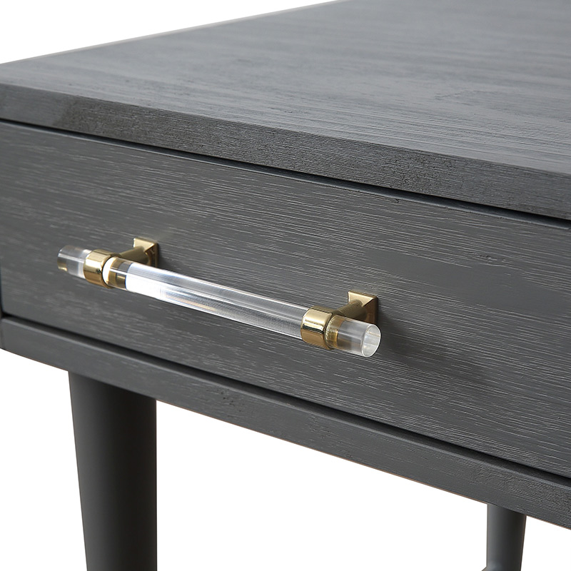 Hecho a mano por artesanos expertos en muebles. Manijas de cajón Lucite. Acabado en laca gris mate Patas doradas de acero inoxidable cepillado Sistema de deslizamiento de cajón de metal sobre metal Requiere montaje menor.
