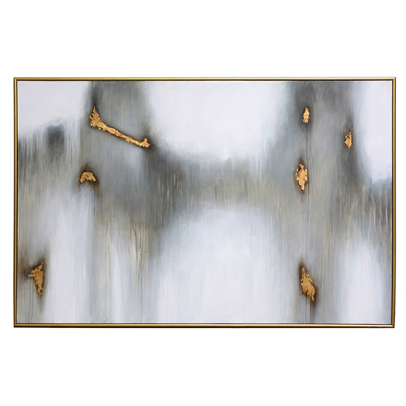 Esta pintura cambiante hace eco de una sensación de sombras y condensación en blanco, negro, gris y dorado. Cuenta con un marco flotante de madera con acabado dorado.